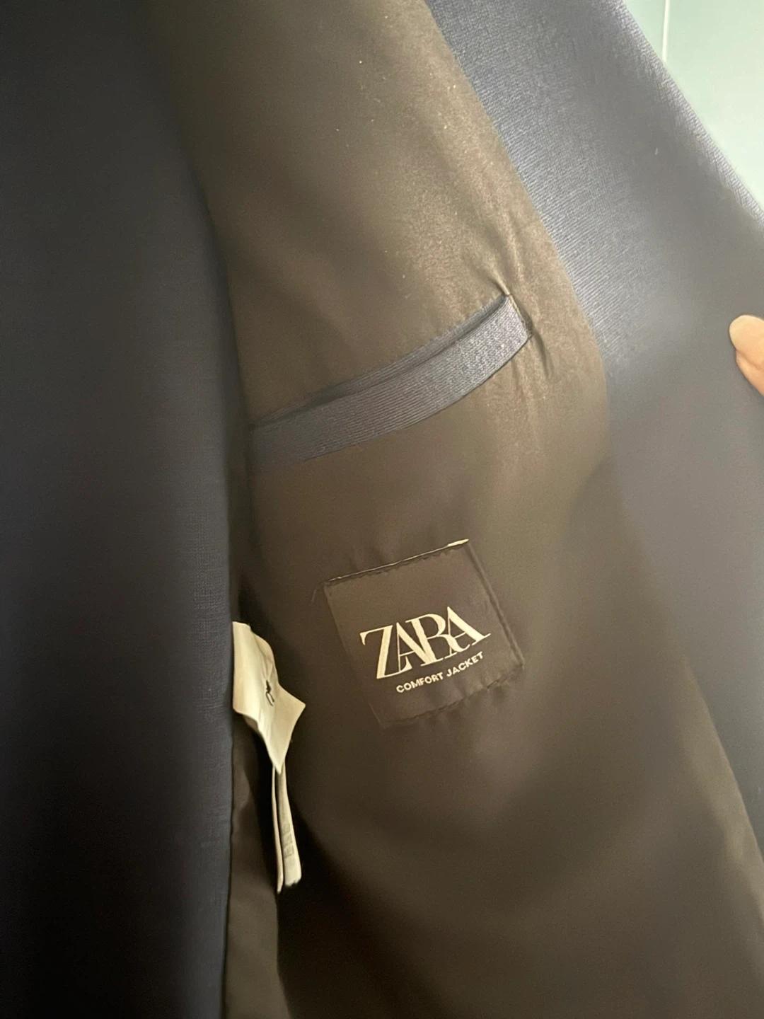ZARA comfort jacket in a navy blue colour. It's a classic blazer style. Material is likely a blend for comfort. This jacket is great for smart casual looks.