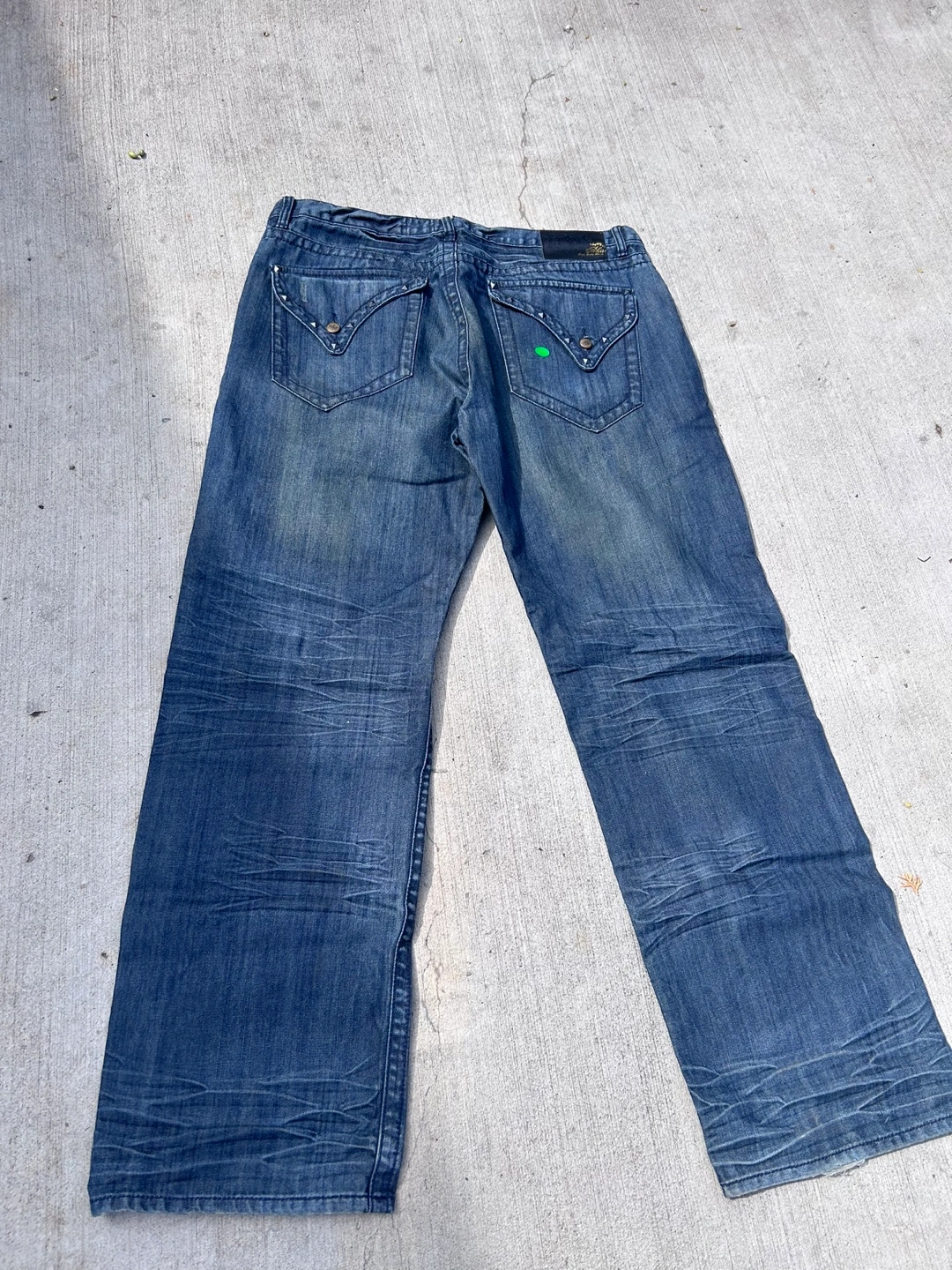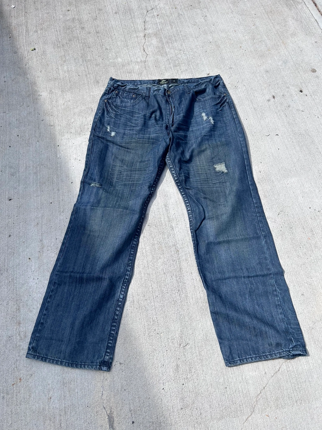 Selling a pair of Ecko Unltd. blue jeans. They have a bit of a distressed look with some rips and fading. Great for a casual, relaxed style!