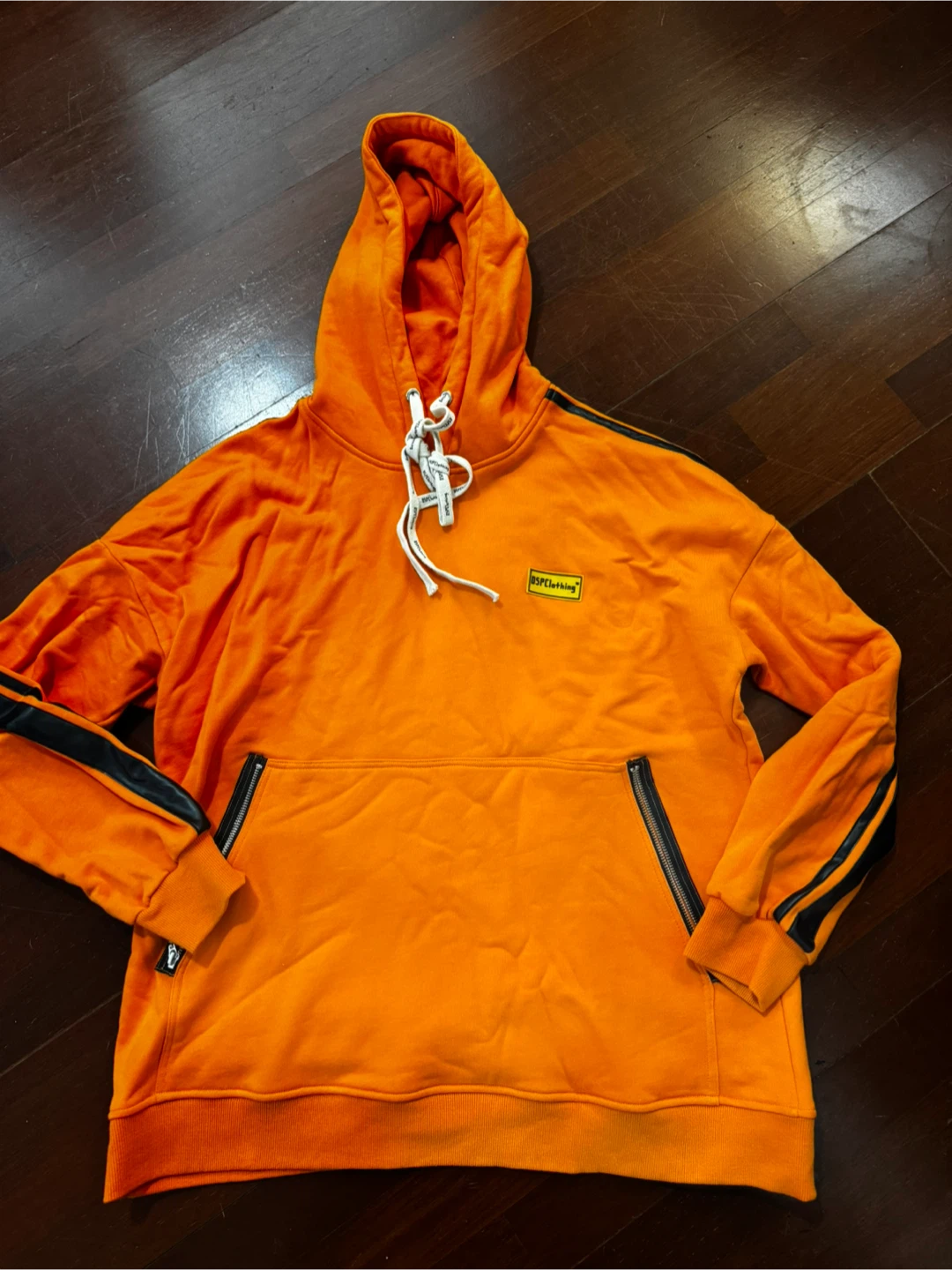 Selling a DSPClothing hoodie in size large! It's a vibrant orange colour with black stripes on the sleeves and a unique zippered pocket design. The hoodie is in great condition and ready for a new owner