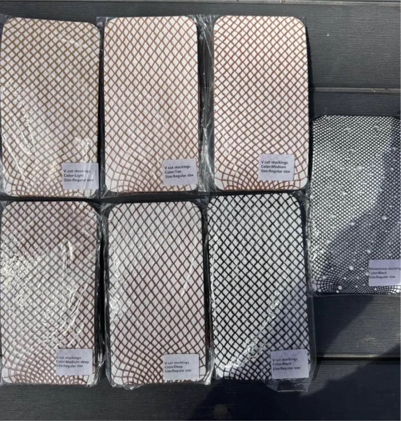 These V-cut stockings come in tan, black, and nude colours. They are fishnet style and a regular size. Also includes one pair of rhinestone stockings in black, regular size.