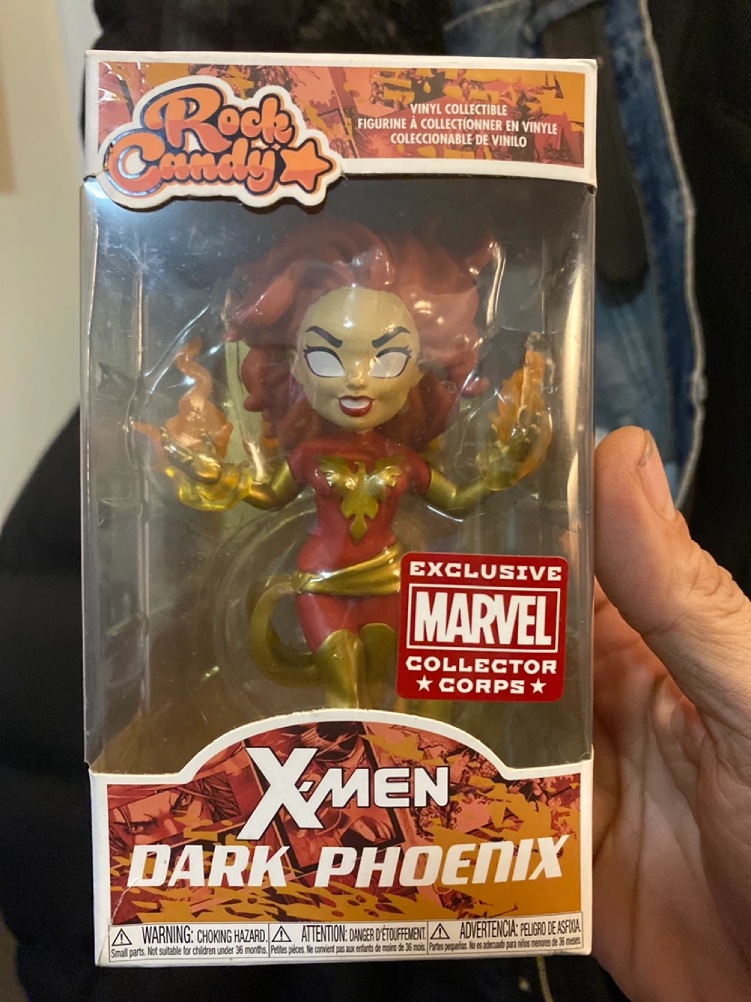 This is a Rock Candy vinyl collectible figure of Dark Phoenix from Marvel's X-Men. It's manufactured by Funko. This collectible is suitable for ages 3 and up.