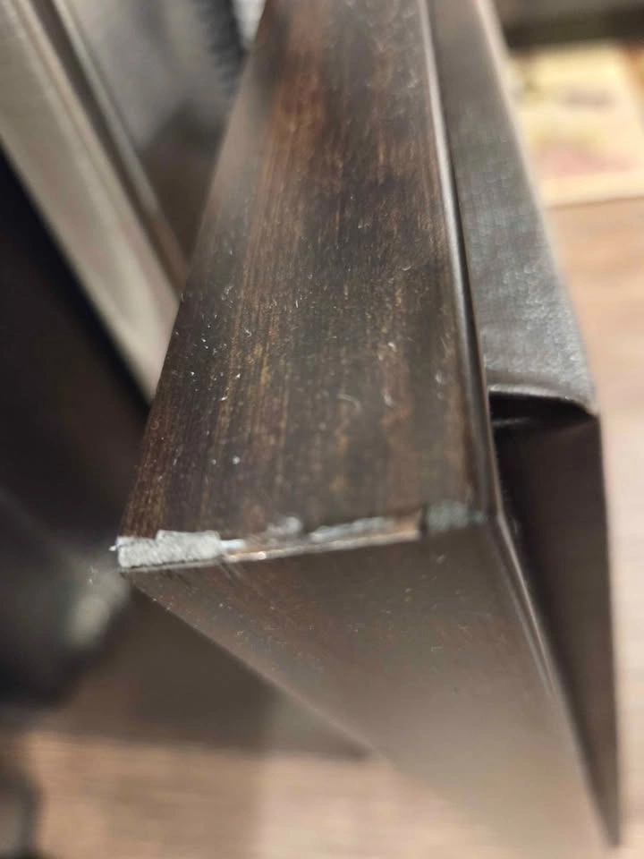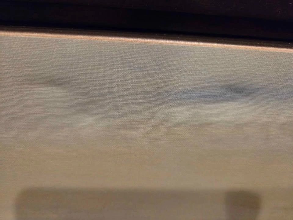 Beautiful framed canvas art. Abstract landscape painting with muted blue, gray, and brown tones. Features a serene river or lake scene with trees. Dark frame. Minor imperfections as shown in pictures. Pick up in Niagara Falls.