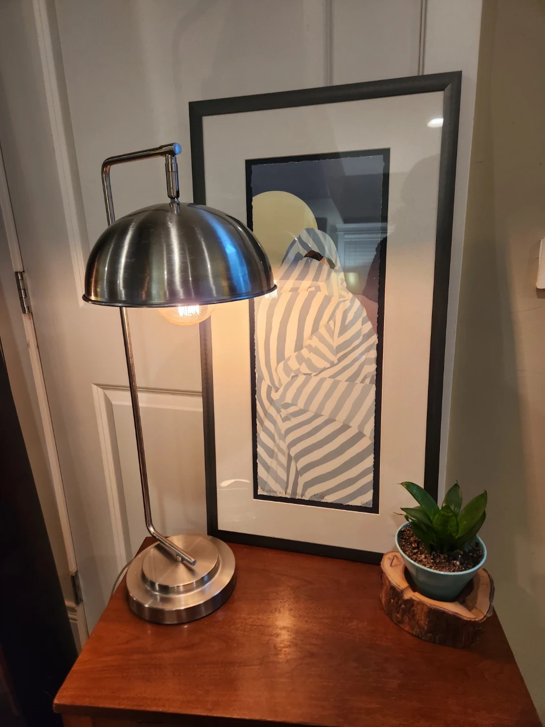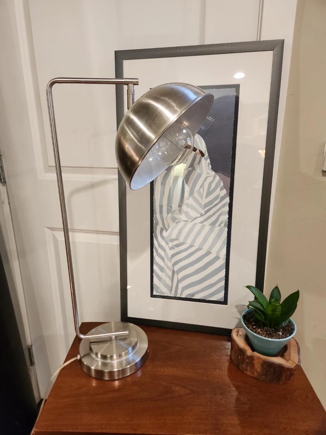 This modern sleek desk lamp, had a mid century modern vibe. Adjustable head design, allow you room light feature plants, art, or projects! The metal dome shade directs light effectively. It's perfect for illuminating your workspace or a reading nook. 27 inches high, with a 8 inch diameter base and a 10 inch diameter lamp head