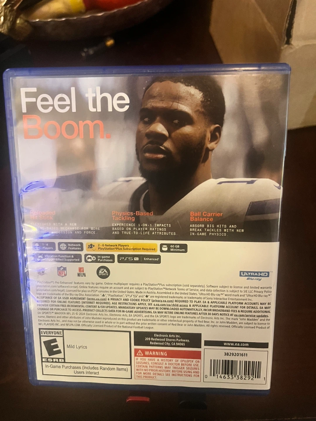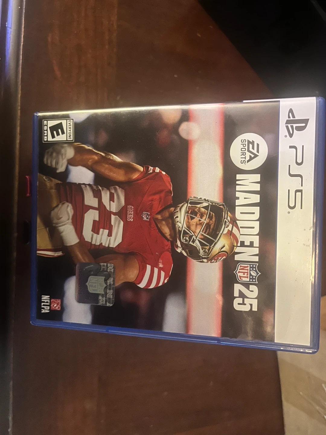 PlayStation 5 game Madden NFL 25. Features 1-4 players and network players. Includes 50 GB minimum storage. Rated E for Everyone.