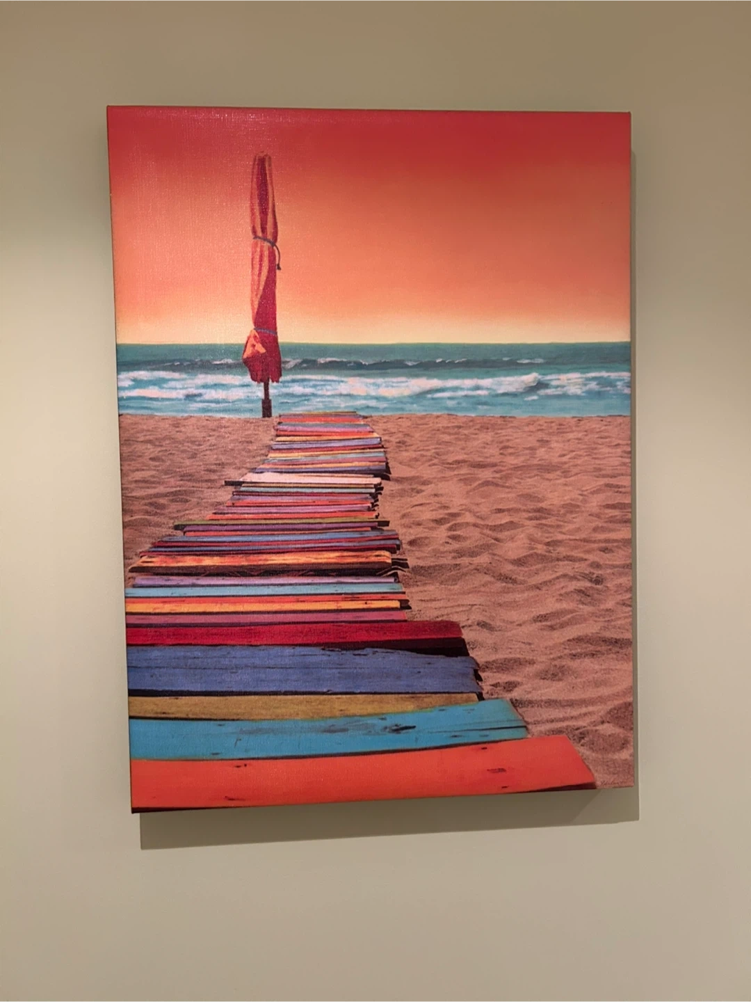Bright canvas print featuring a colourful boardwalk leading to the ocean. It depicts a beach with waves and a red umbrella. The print has a vibrant sunset sky.