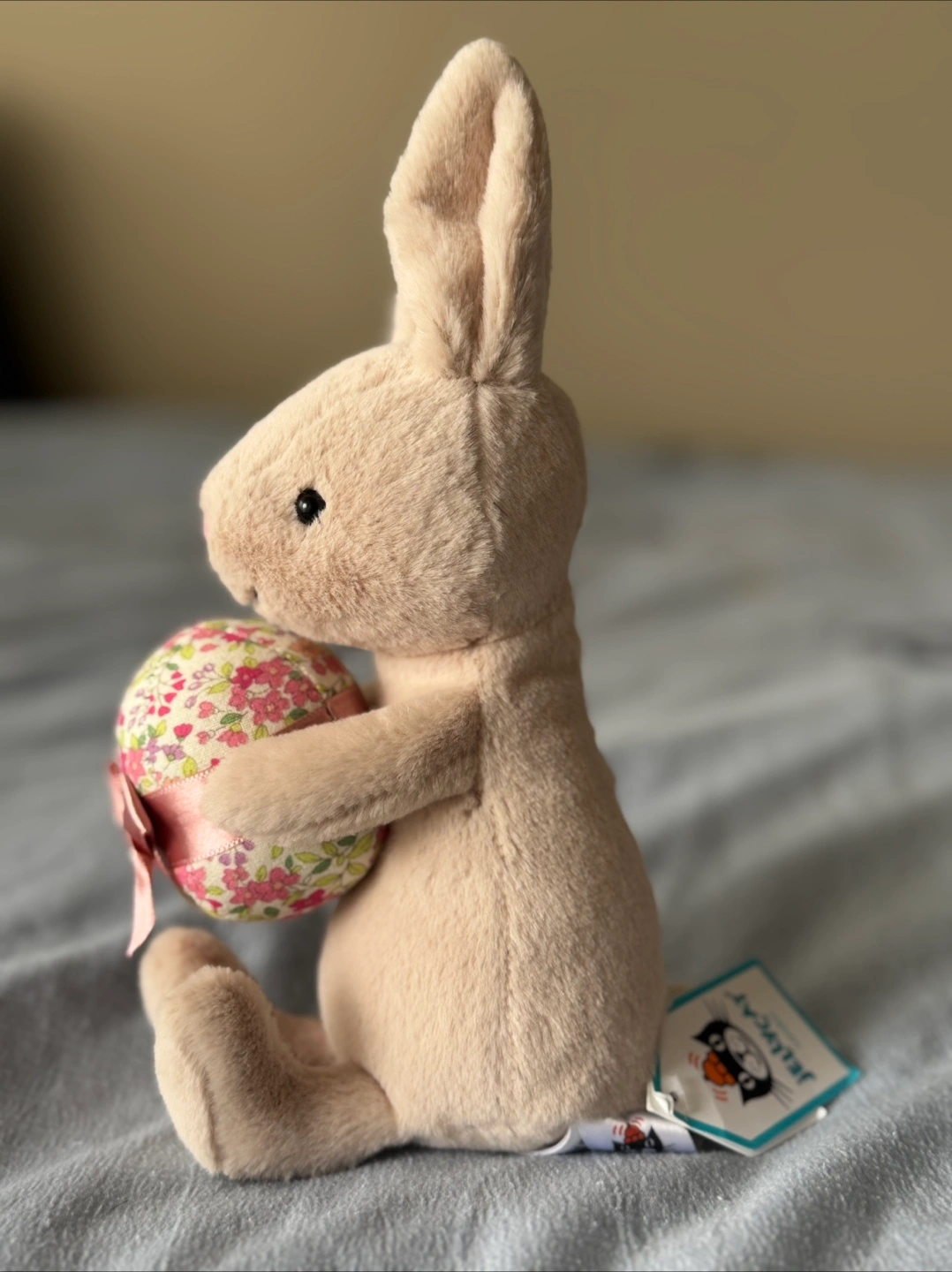 This is a sweet Jellycat beige bunny plush toy holding a floral-patterned egg. The bunny's ears are soft and floppy, and it's adorned with a pink satin bow around the egg. It's a lovely little friend for Easter or any time! 100% real and 100% new with tag.