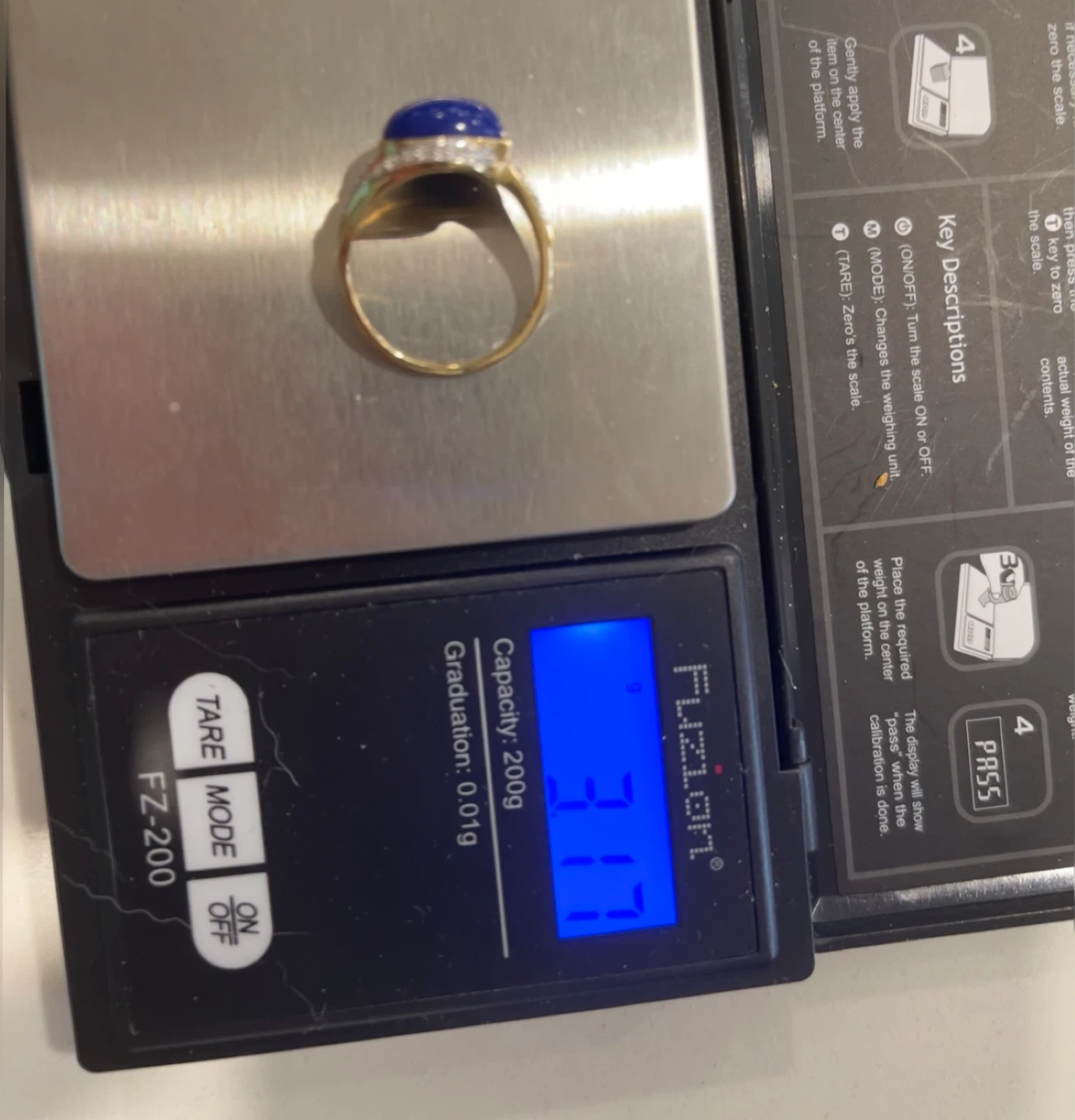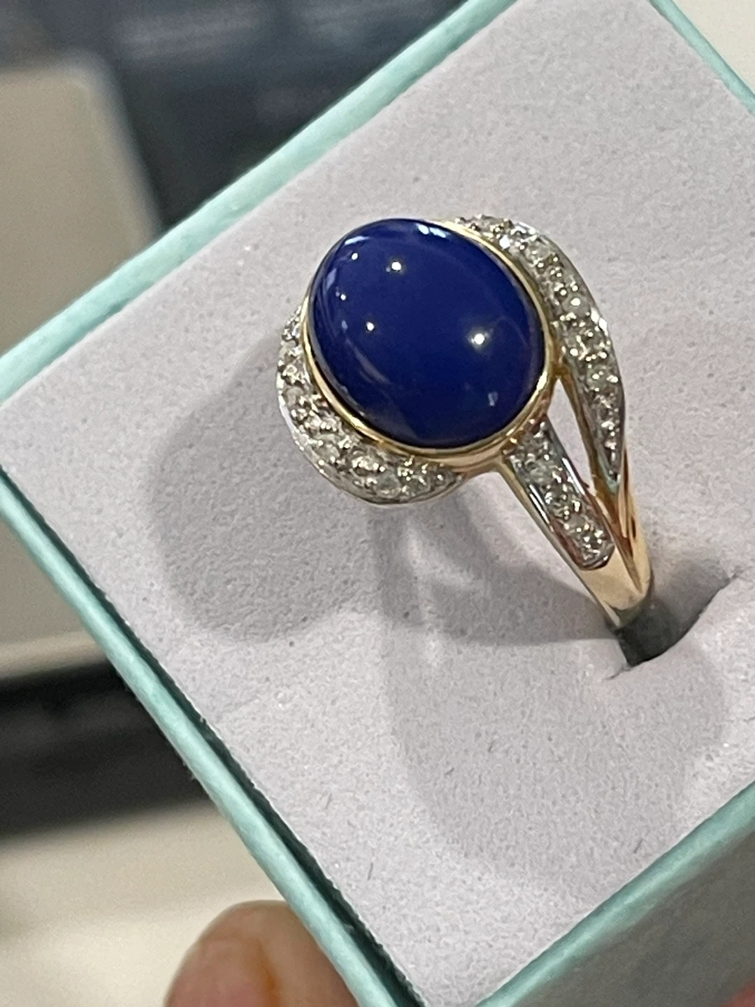 A beautiful 14k gold ring featuring a large, oval lapis lazuli stone surrounded by small diamonds. The band is crafted from gold. This ring would make a lovely statement piece.