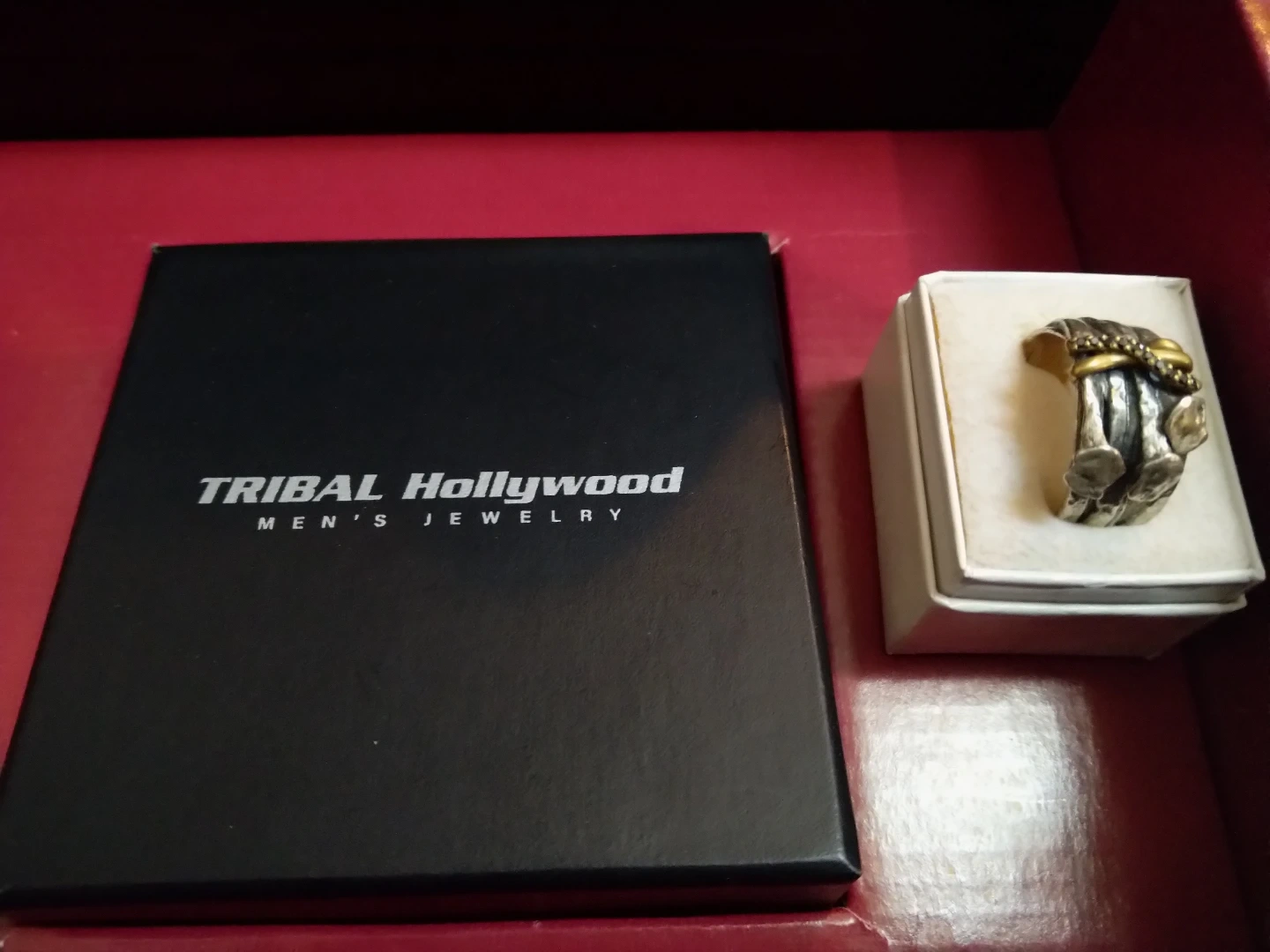 This is a Tribal Hollywood men's ring. It's a size 12, made from silver and brass. This ring is designed with a unique 'bound nails' style. The original box is included.