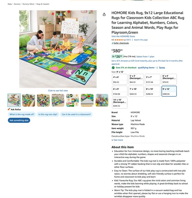 This massive, high-quality educational rug is brand new and features vibrant colors to help kids learn their alphabets, numbers, colors, shapes, and animal names while they play. Brand: HOMORE Dimensions: 9 feet x 12 feet (Extra Large) Material: Soft "Lap Velvet" surface that is skin-friendly and easy to clean. Features: Educational: Includes letters A-Z with animals, numbers 1-9, geometric shapes, and seasonal themes. Non-Slip: Features a strong TP rubber backing to keep the rug securely in place on hardwood or tile floors. Low Pile: Durable, non-shedding construction that is easy to vacuum. Condition: Brand New (still in original vacuum-sealed packaging). Our Price: $190. Cash accepted.
