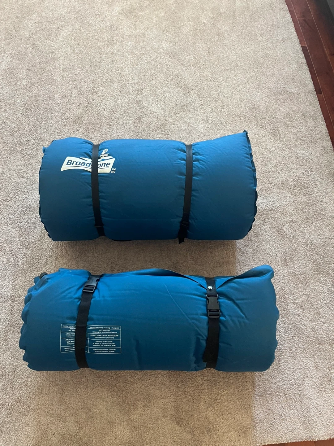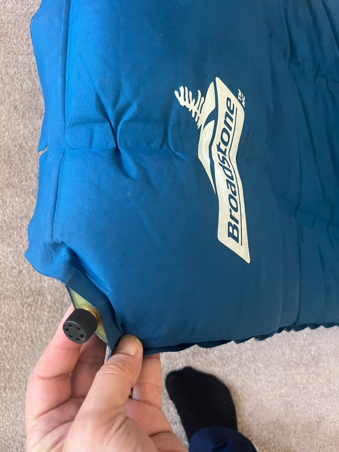 This is a Broadstone self-inflating sleeping pad. It's blue and rolls up compactly for travel. A handy camping essential!