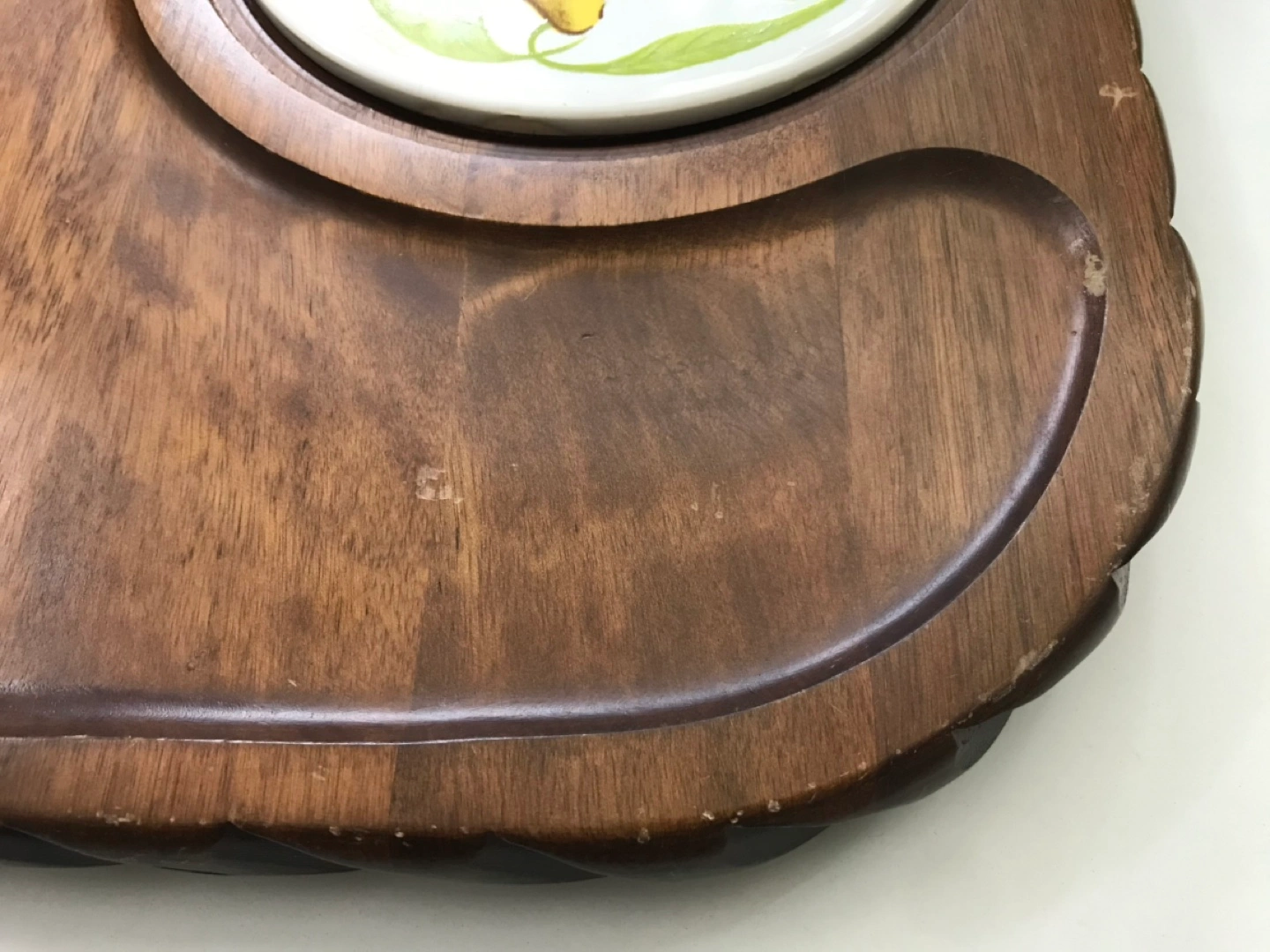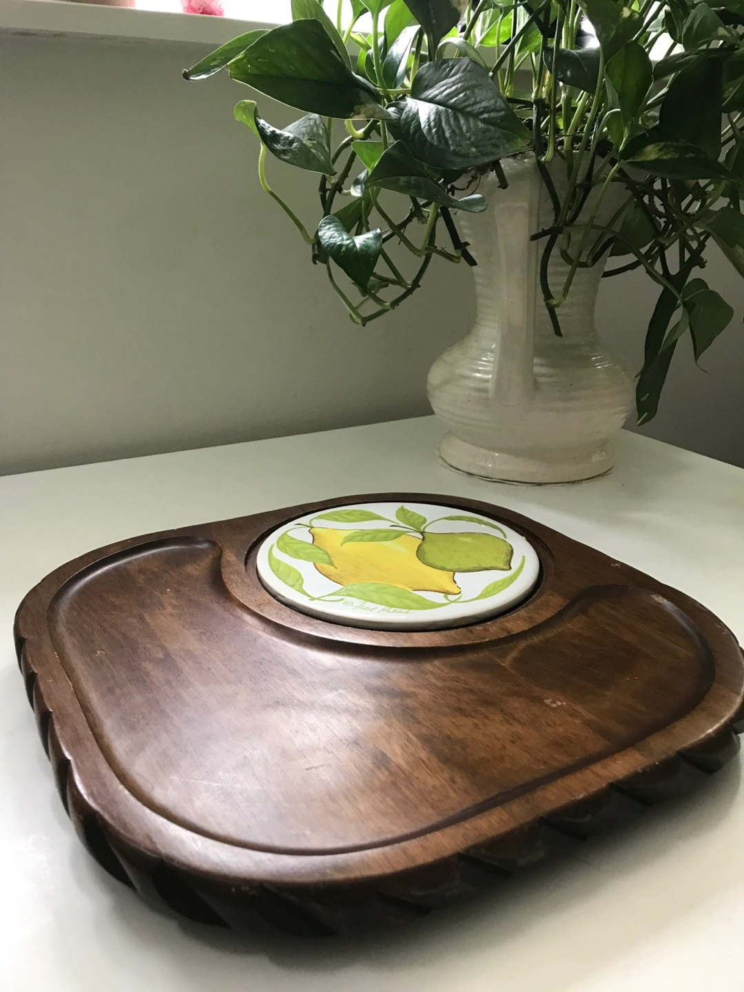 Wooden serving tray with a ceramic insert featuring a lemon design. The tray has a carved design around the edges and features two dips.