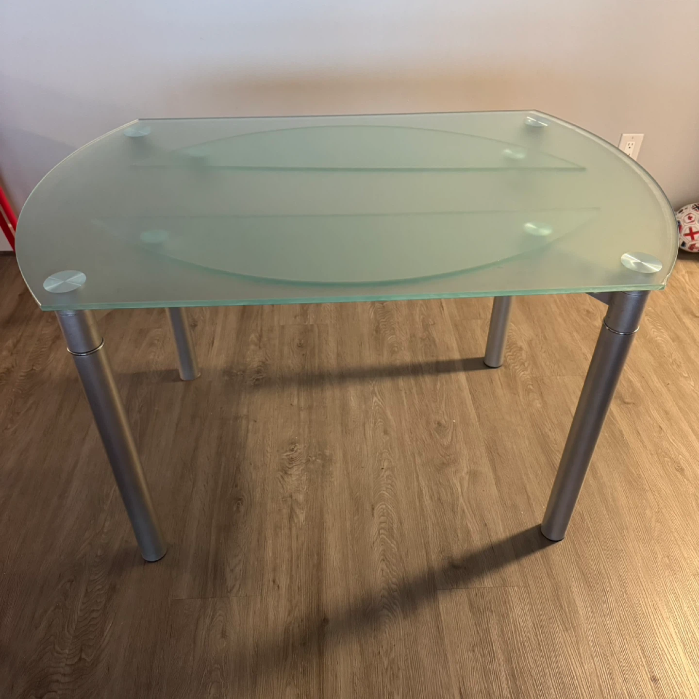 This is a modern glass top dining table with silver metal legs. It's a compact size, expandable to round table,perfect for smaller dining spaces. The frosted glass top is supported by sturdy cylindrical metal legs. Useful for 4-6 people. Can be sold by 6 red plastic chairs. Good for indoor and outdoor.