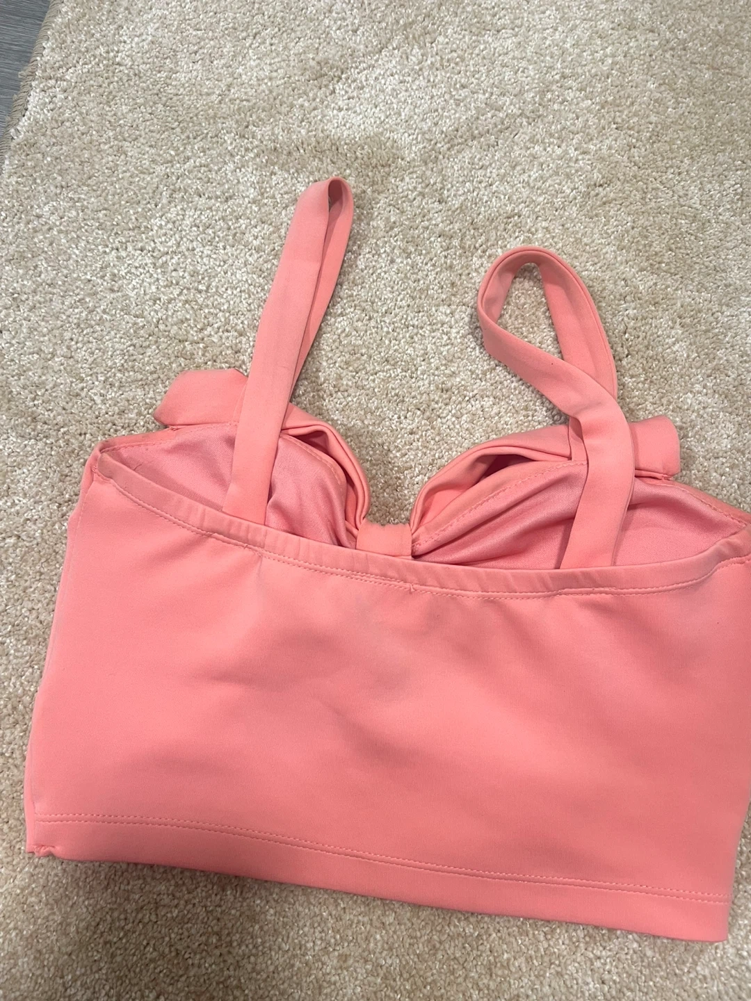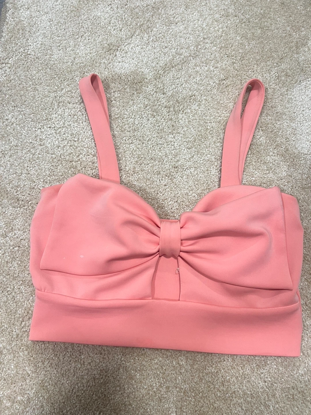 A cute pink crop top with a large bow detail on the front. It has adjustable spaghetti straps for a comfortable fit. Made from a smooth fabric.