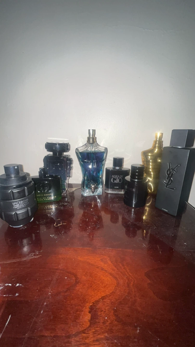 A collection of men's designer colognes including Viktor & Rolf Spicebomb, Gucci Guilty, Jean Paul Gaultier, Giorgio Armani Acqua di Gio, Dior Sauvage, and Yves Saint Laurent La Nuit de L'Homme. Various sizes and scents available. Open to offer