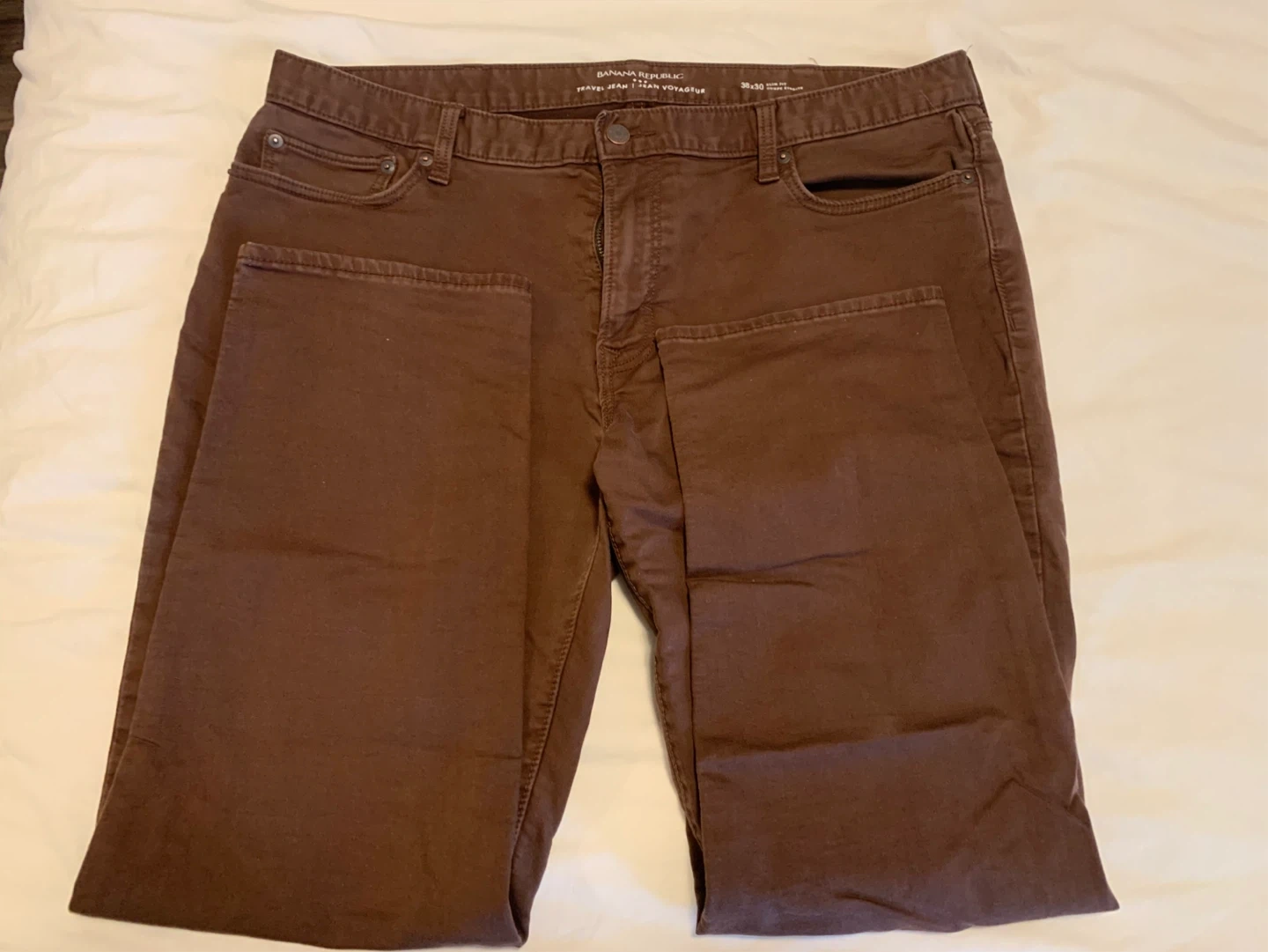 Selling a pair of Banana Republic Travel Jeans in size 36x30. The jeans are a nice brown colour and are in great shape. Perfect for travel or everyday wear!