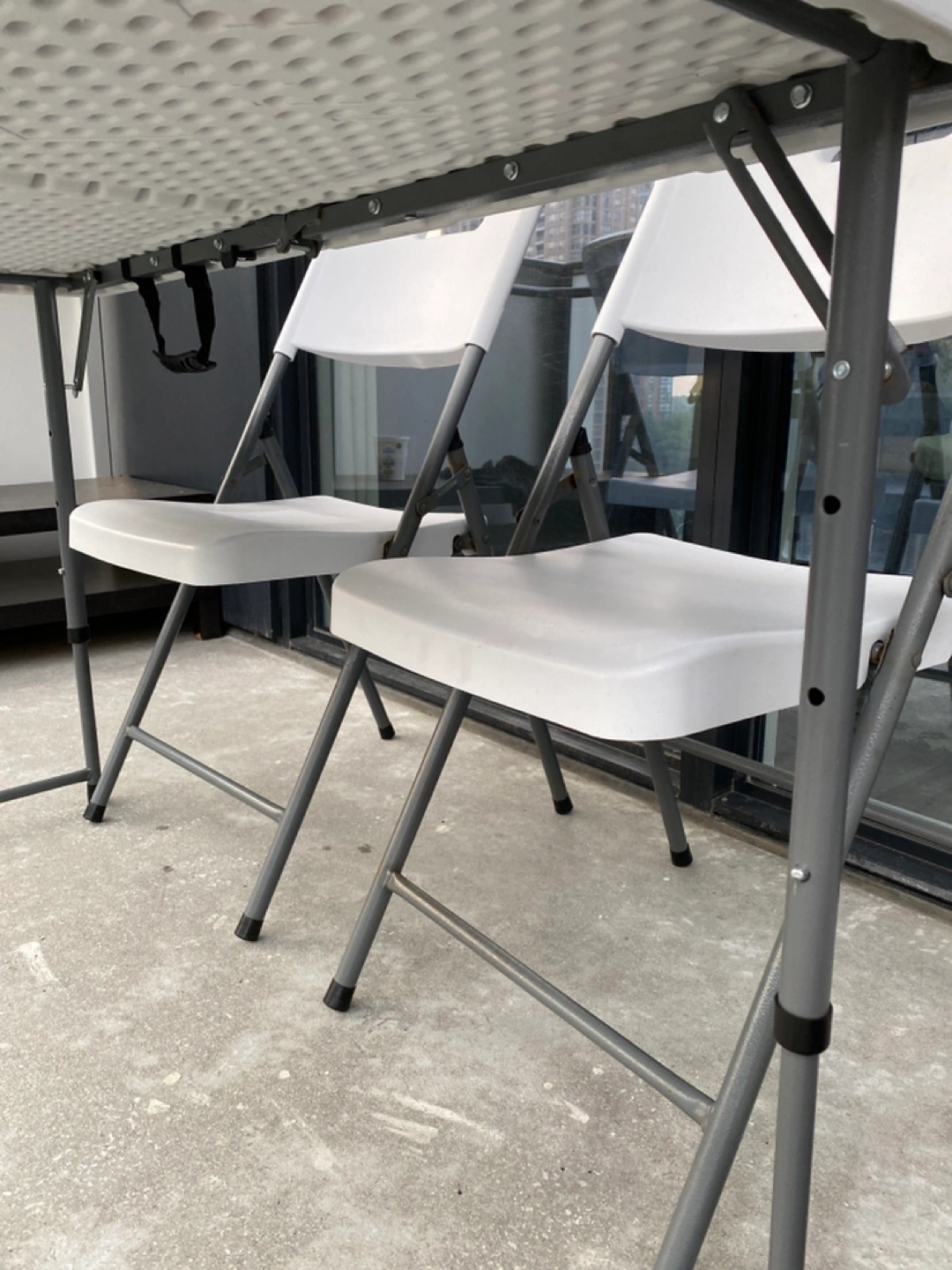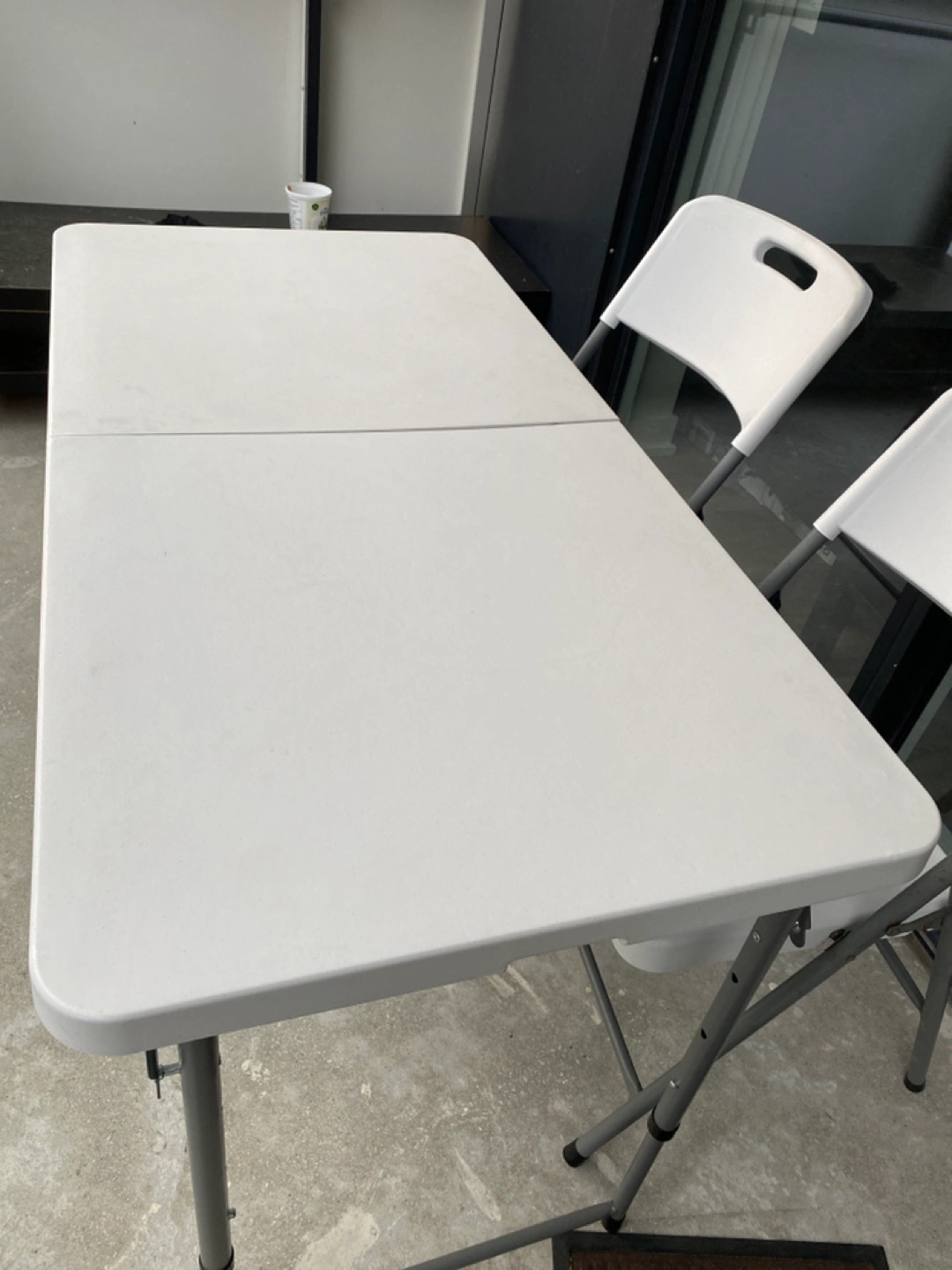 I am selling a set that includes a table and chairs. The table appears to be rectangular, white with foldable legs. The chairs appear to be white and fold for easy storage. Perfect for an outdoor gathering on a warm day.