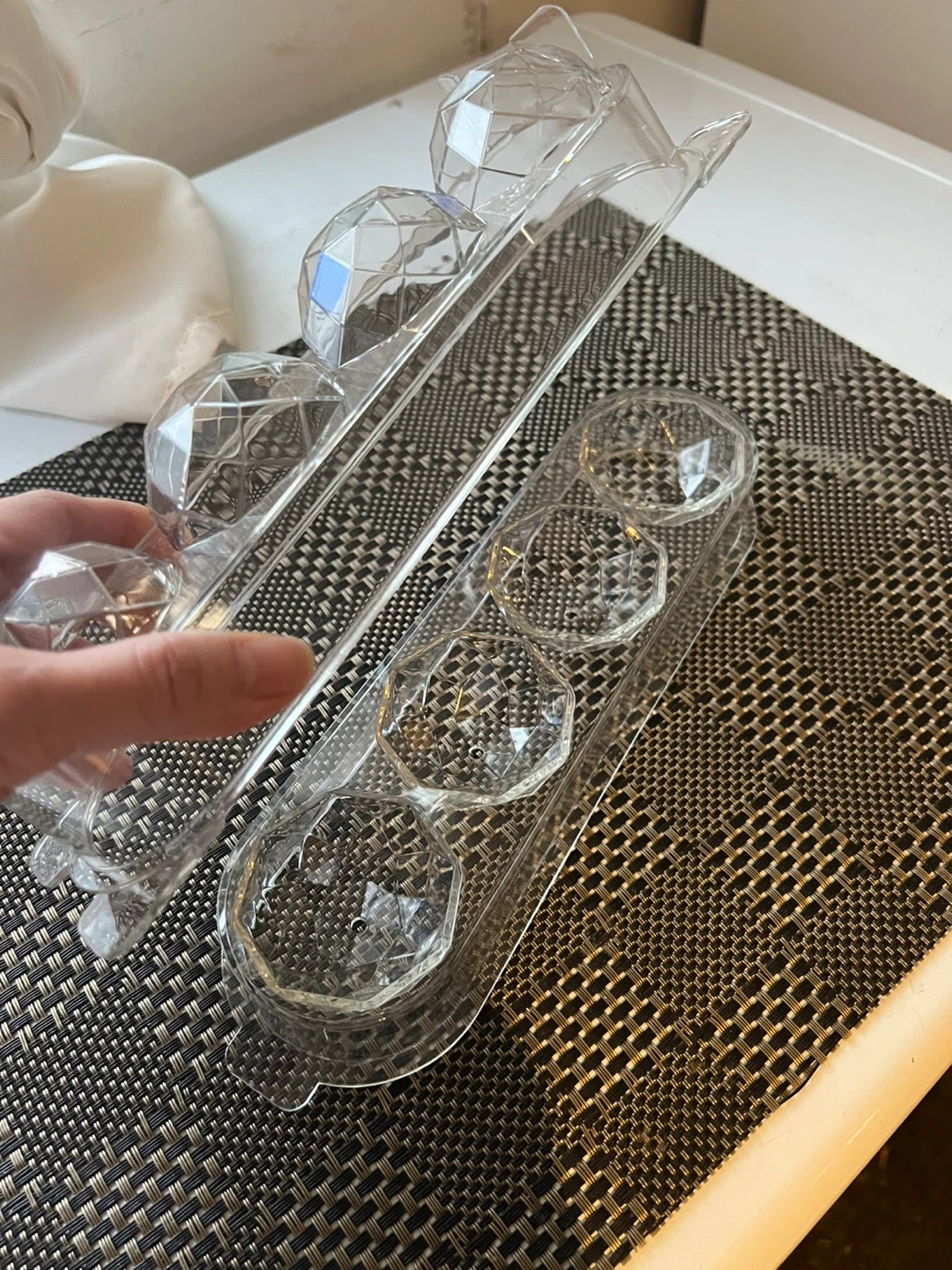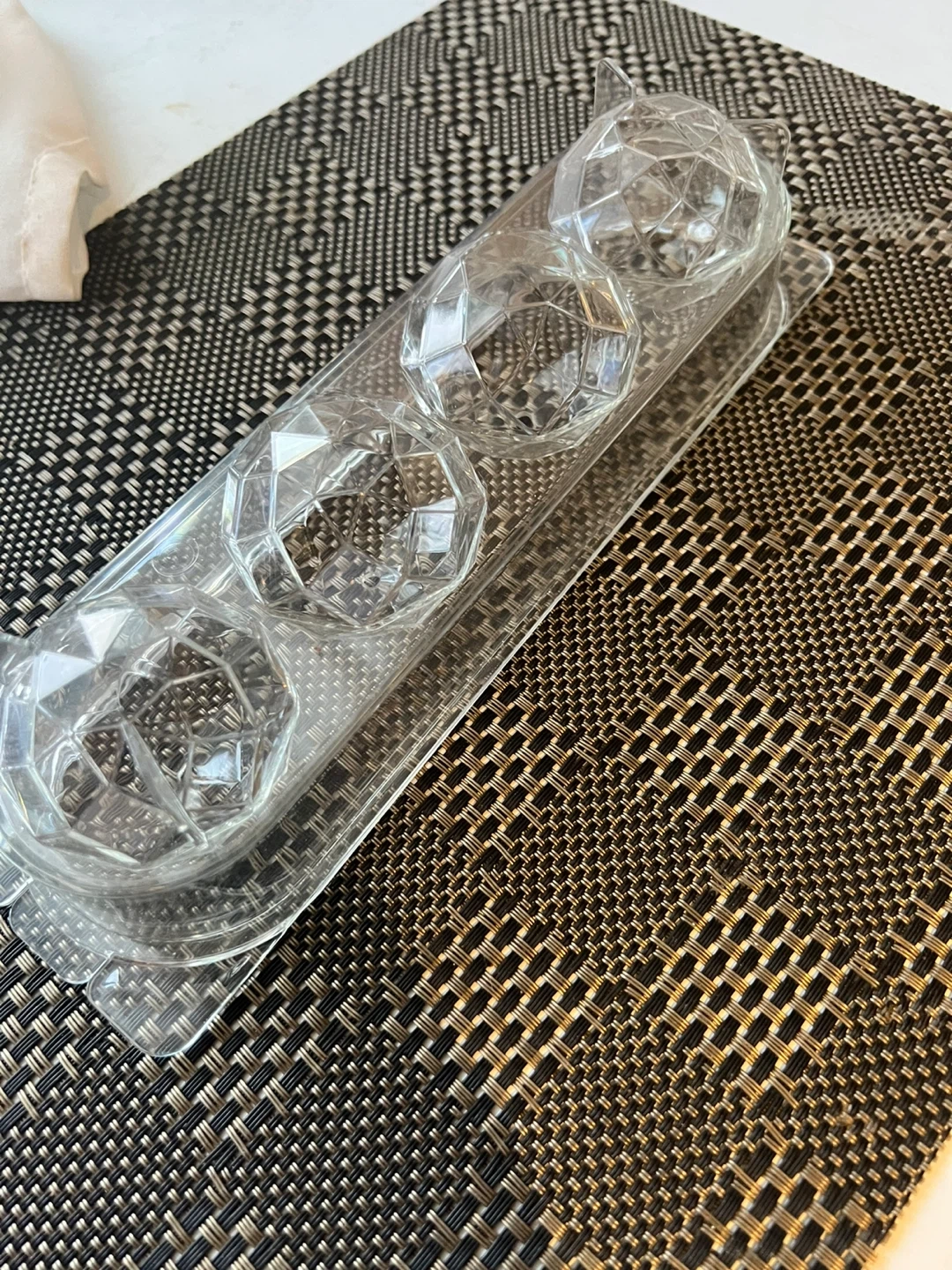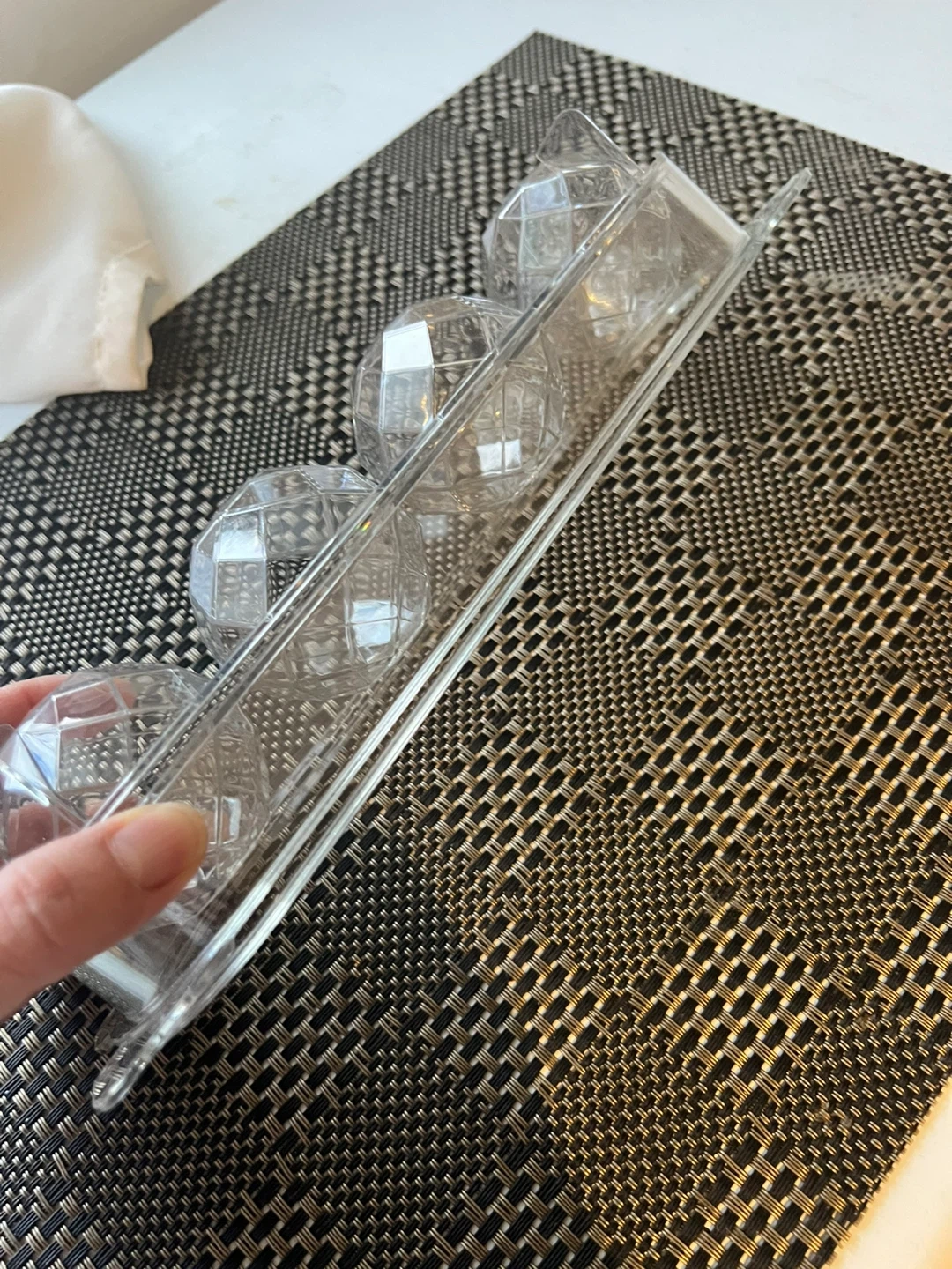 Make fancy spherical ice with this clear plastic mold. It holds four spheres, perfect for chilling drinks. The diamond-cut design on the ice adds a nice touch to cocktails!