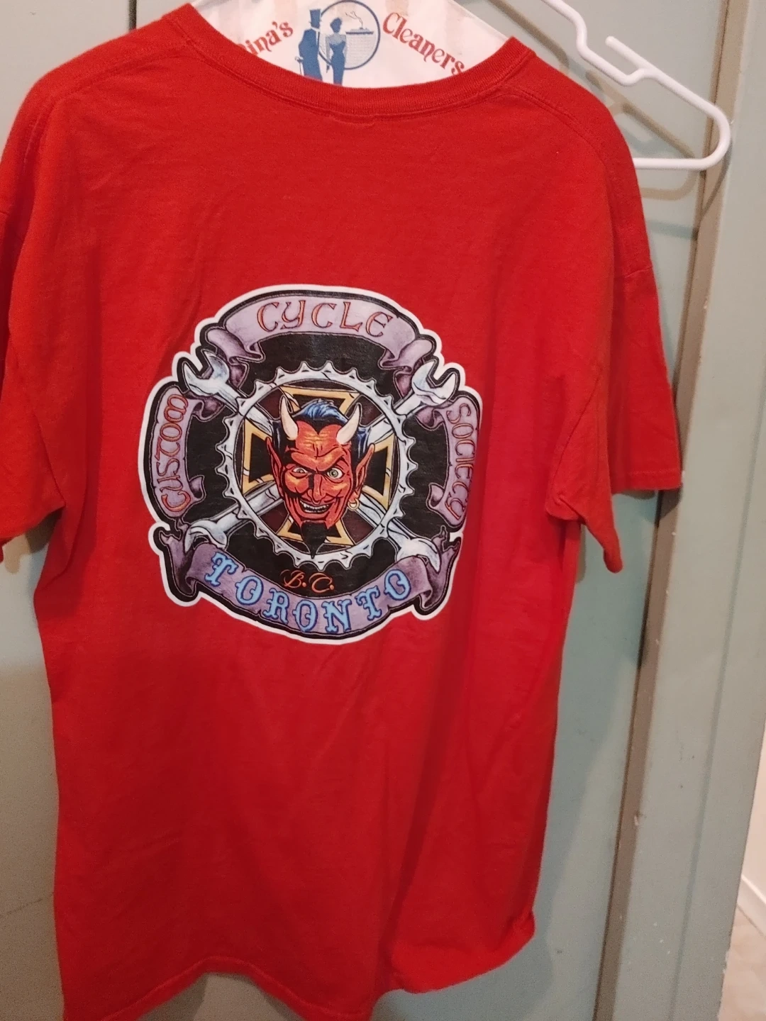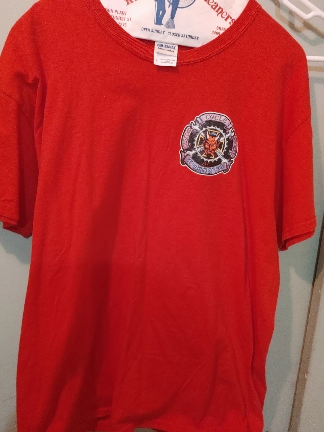 This is a red Gildan Ultra Cotton t-shirt in size large. It's made from 100% pre-shrunk cotton. The shirt features a graphic design with 'Ghost Souls Cycle Toronto B.C.' text.