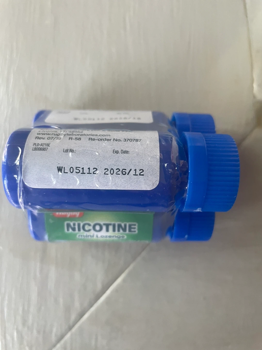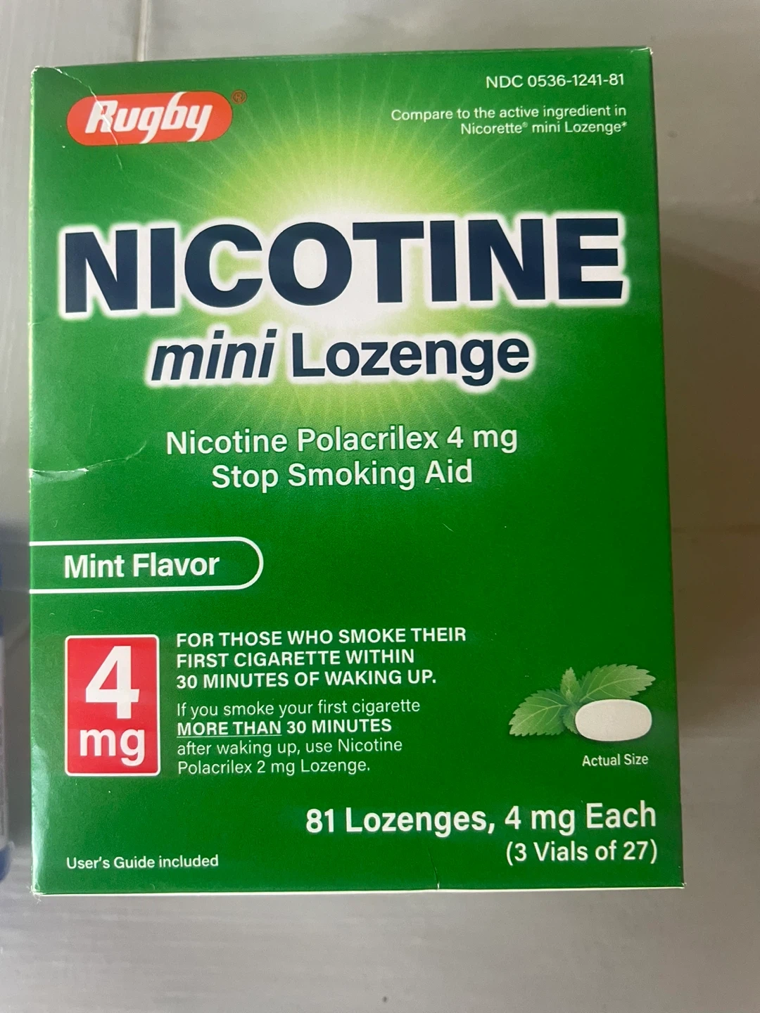 This is a box of Rugby Nicotine mini lozenges in mint flavor. Each lozenge contains 4 mg of Nicotine Polacrilex. It's a stop smoking aid. The box contains 81 lozenges, packaged in 3 vials of 27 lozenges each. One vial expires 2026/08 and another expires 2026/11.