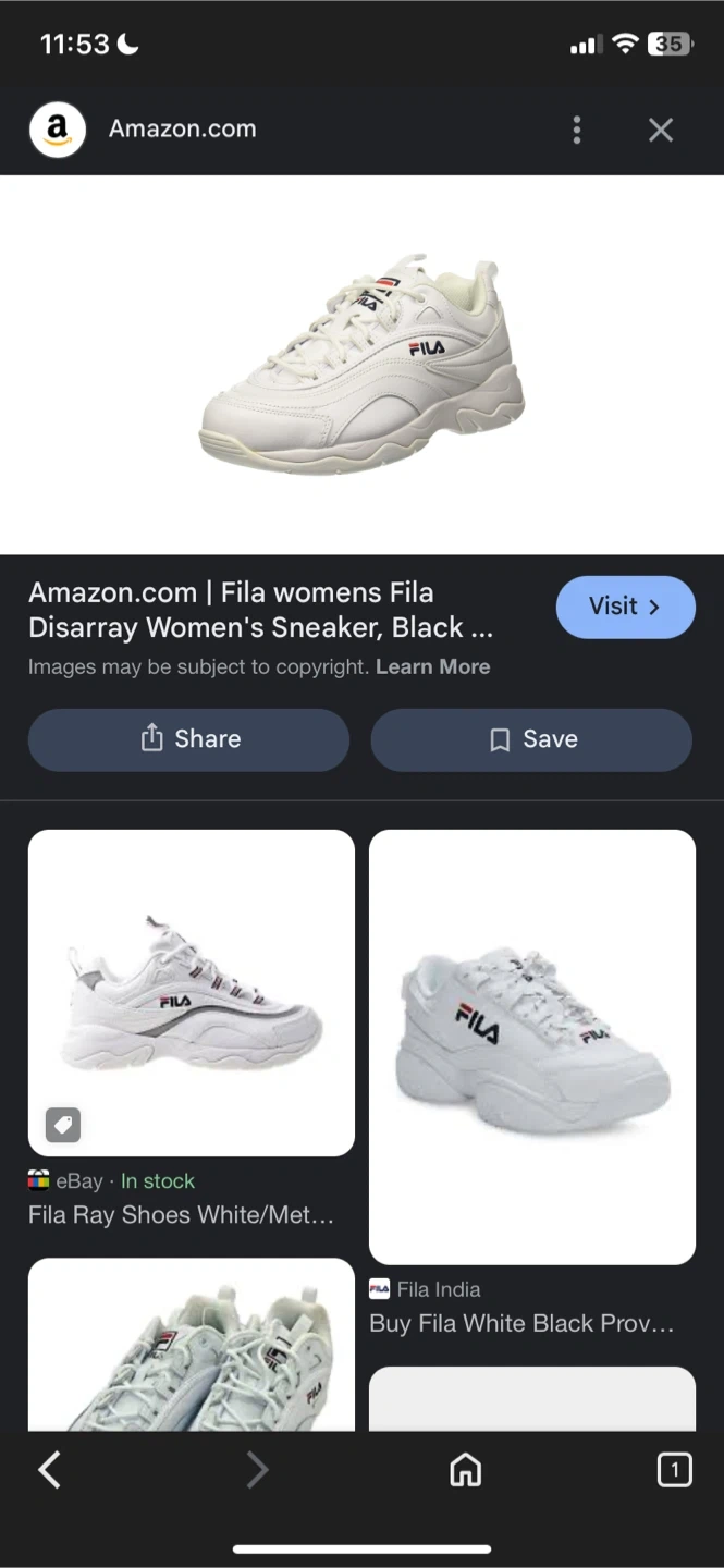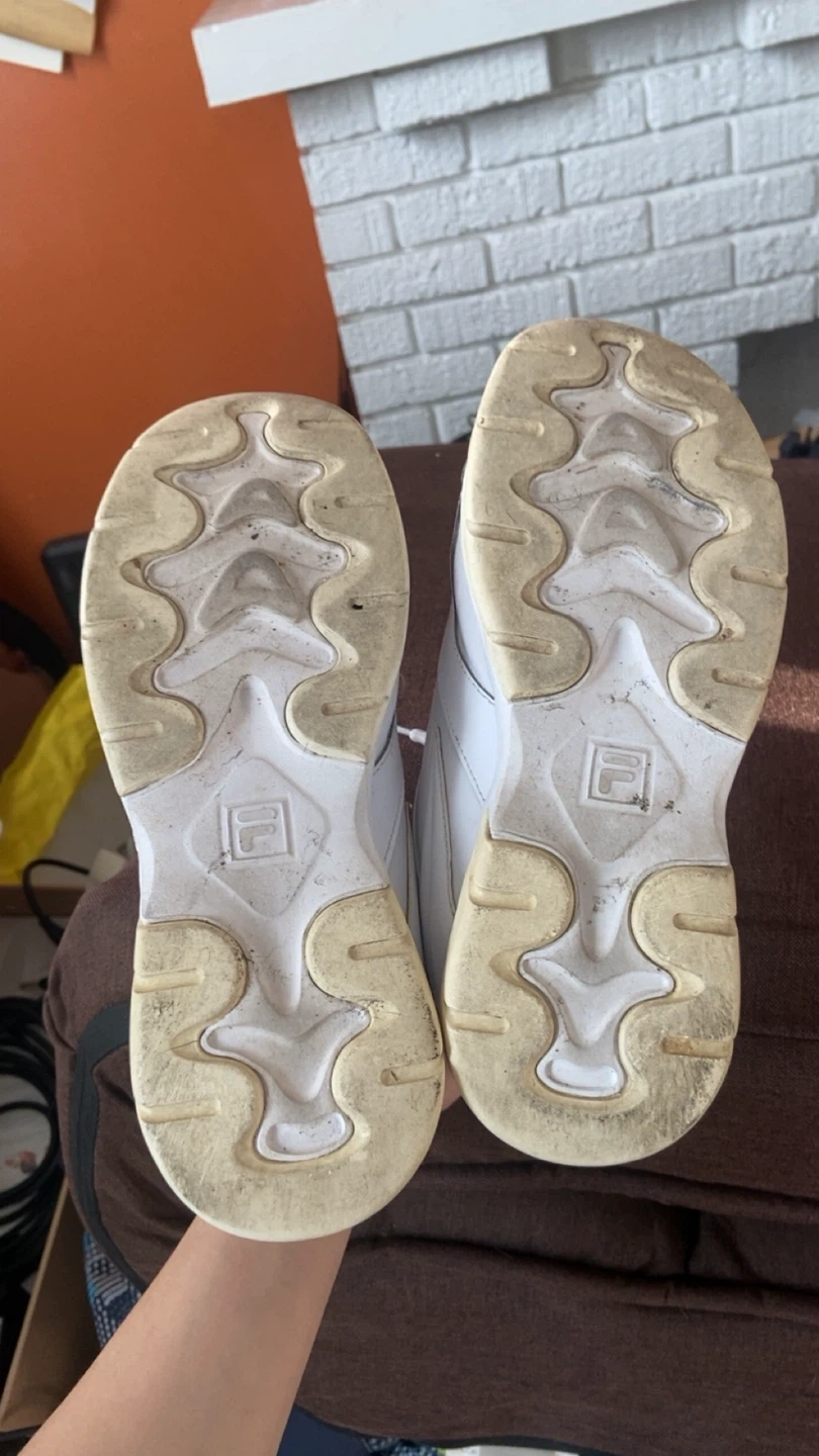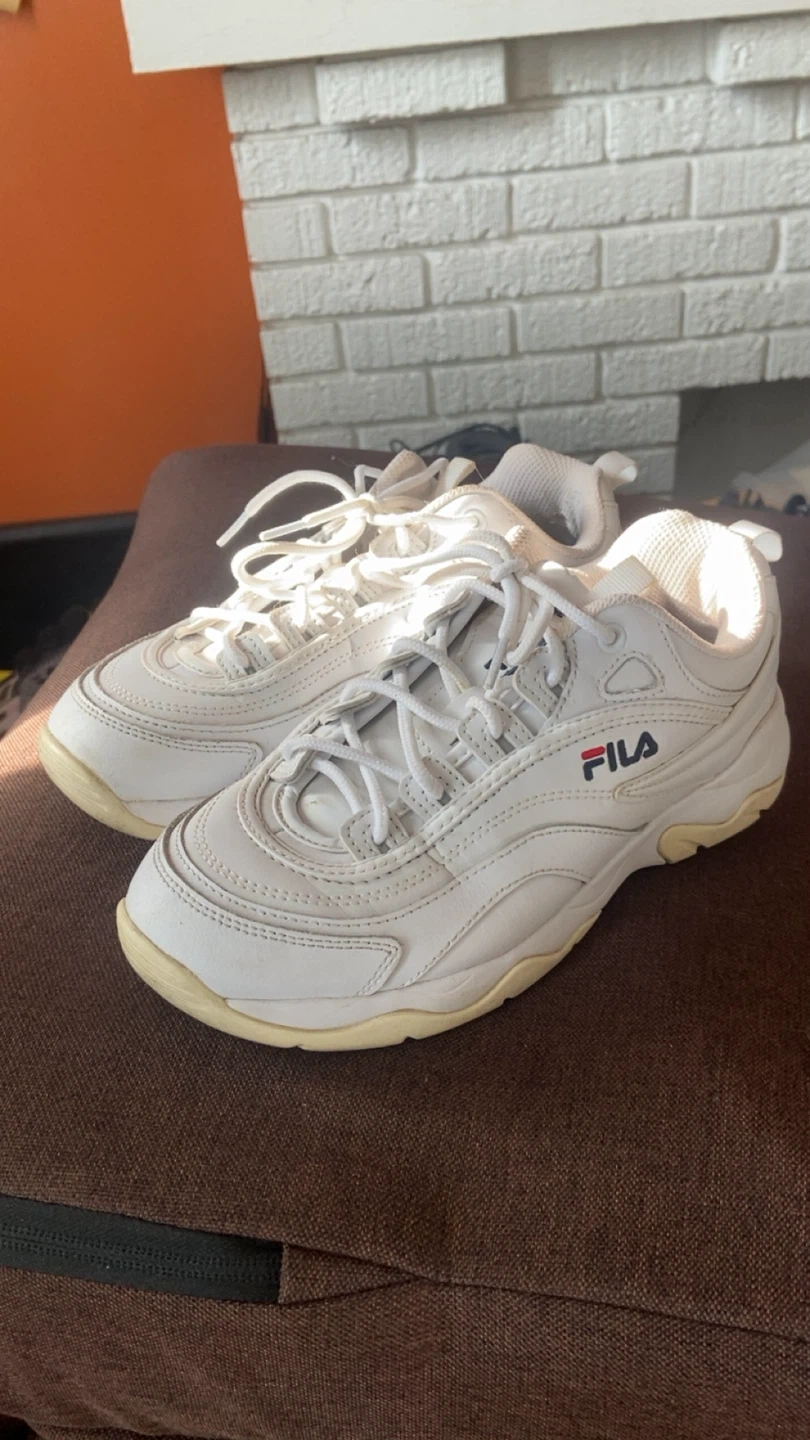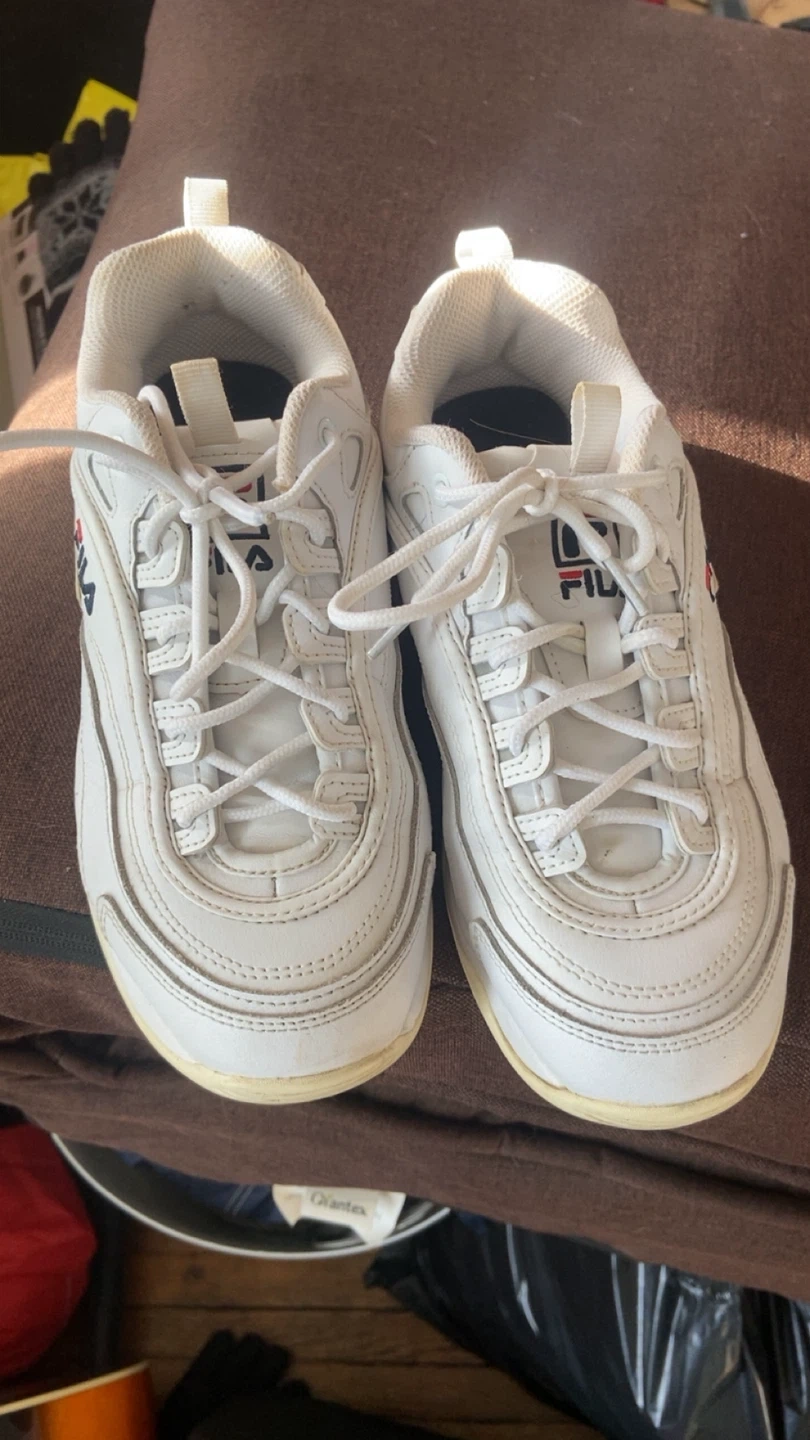 Selling a pair of Fila Disarray women's sneakers in size 8. They are white and show some signs of wear on the soles, but are otherwise in good condition. Great for casual wear or workouts!
