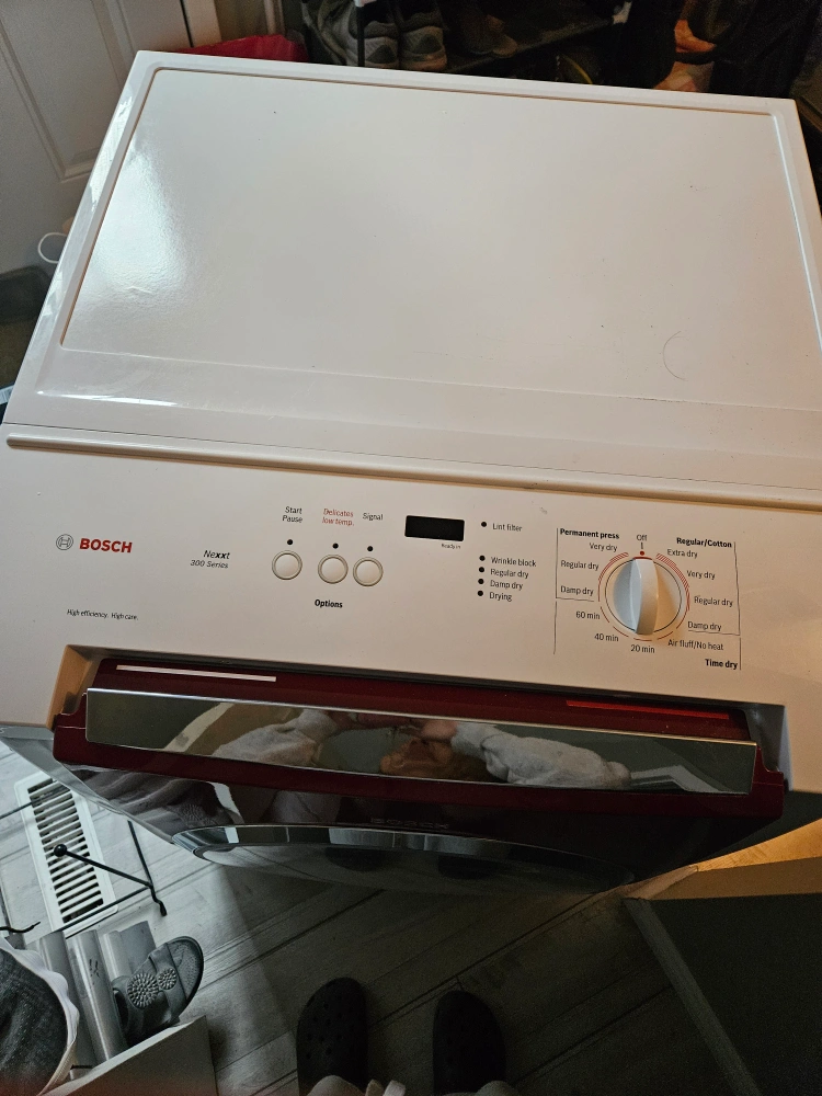 Bosch clothes dryer in a striking red and white colour scheme. It's a front-loading appliance with a large glass door. This dryer is designed for efficient laundry care. Washer broke, had to get a new set but the dryer is in good working condition. Dim: 27" W x 48" D with door open 90 legs x 37" H