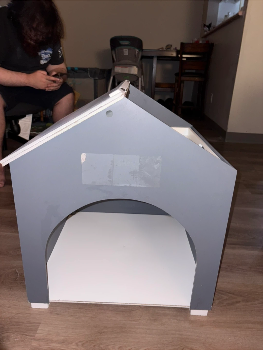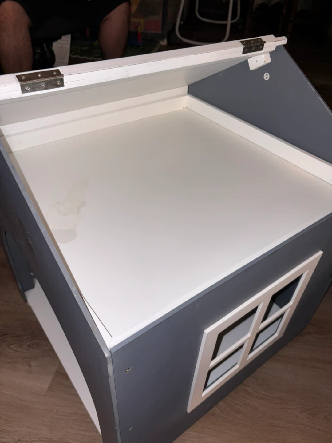 This cute little house is perfect for dolls or small pets. It's made of wood and features a grey exterior with a white interior and window detail. It has a hinged roof for easy access.