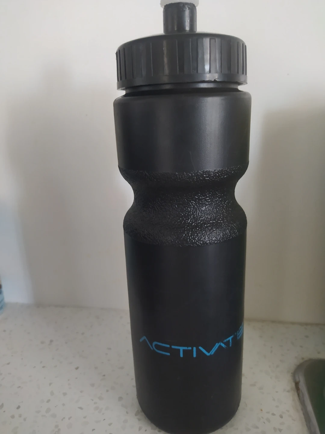 Black plastic water bottle with a screw-on lid and spout. It's embossed with the 'Activate' logo in blue. This bottle is great for staying hydrated during workouts or on the go!