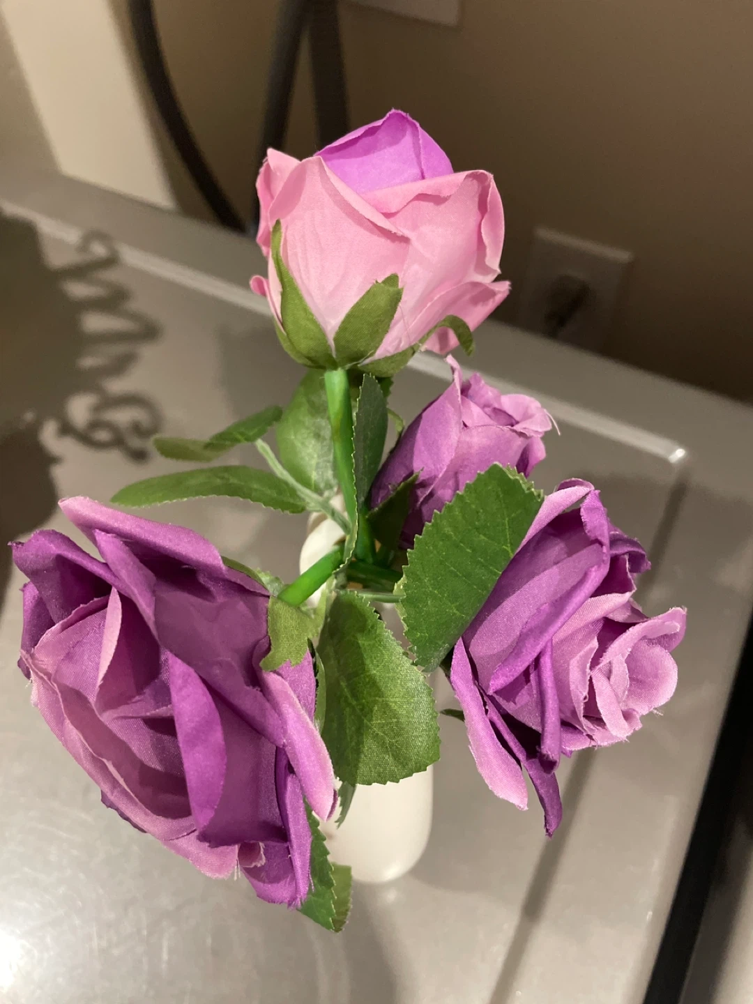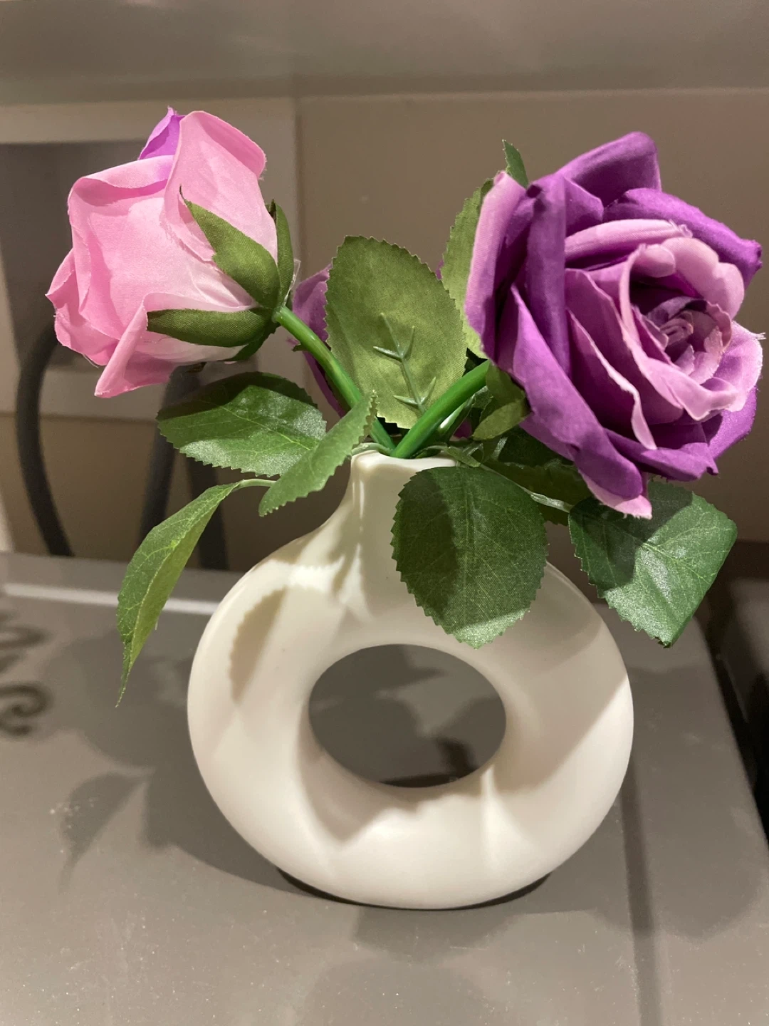 This set includes artificial roses in shades of pink and purple, presented in a modern white vase with a unique circular opening. It's a lovely decorative piece for any room. The vase is ceramic.
