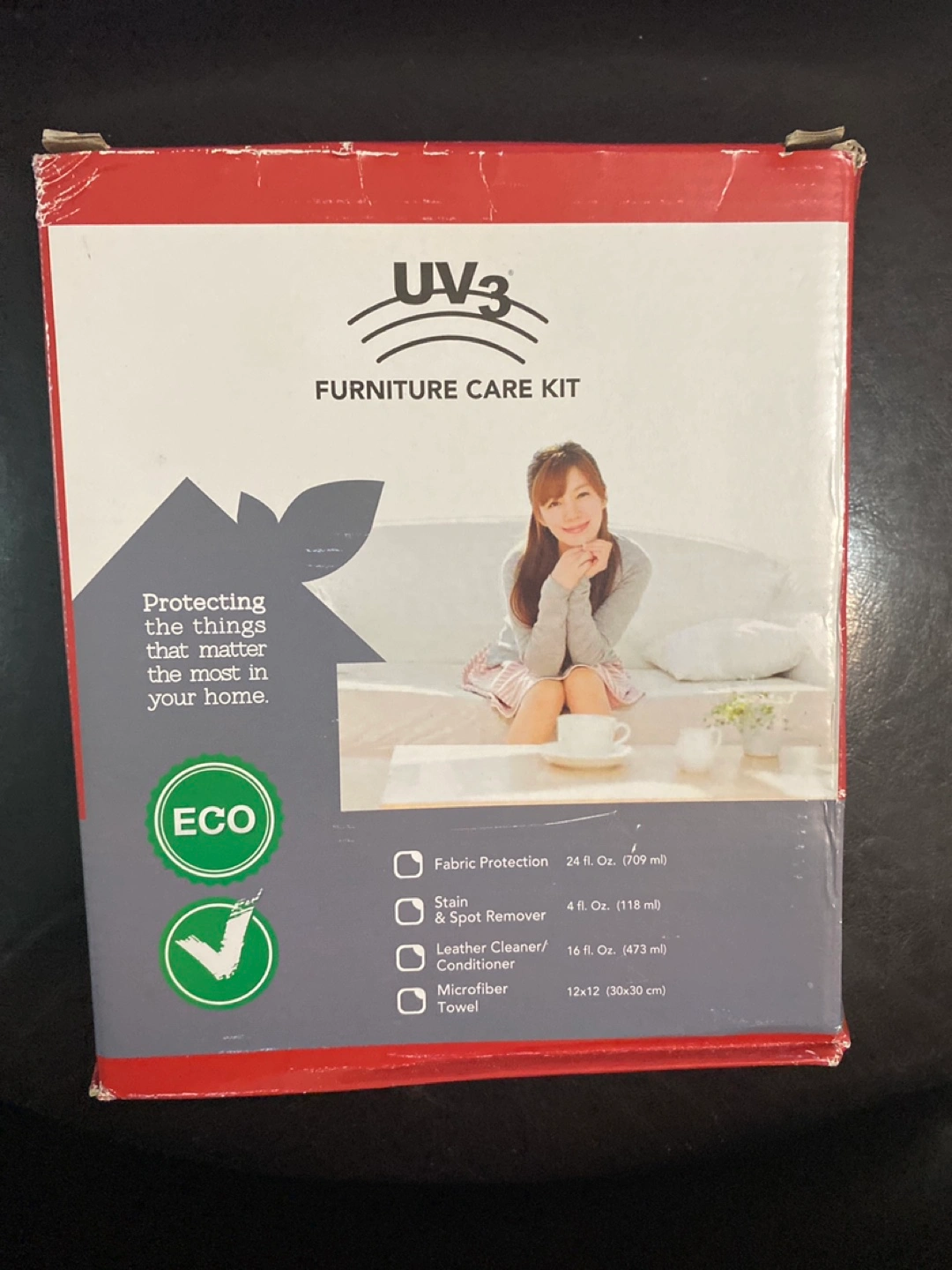 New furniture care kit. Includes fabric protection, stain and spot remover, leather cleaner/conditioner, and microfiber towel. Eco-friendly.