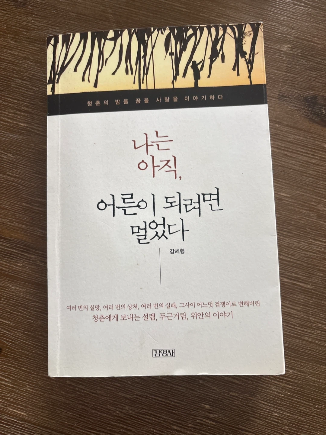 I'm Still Far From Becoming an Adult. This book is written by Kang Se-hyeong and published by Kim Young-sa. It shares stories of excitement, nervousness, and comfort for youth, reflecting on disappointments, hurts, and failures. The book's subtitle translates to 'Talking about dreams, love, and youth'.