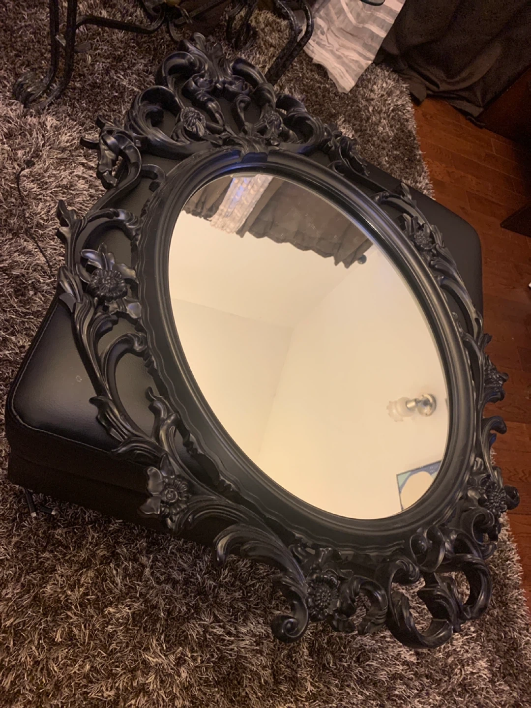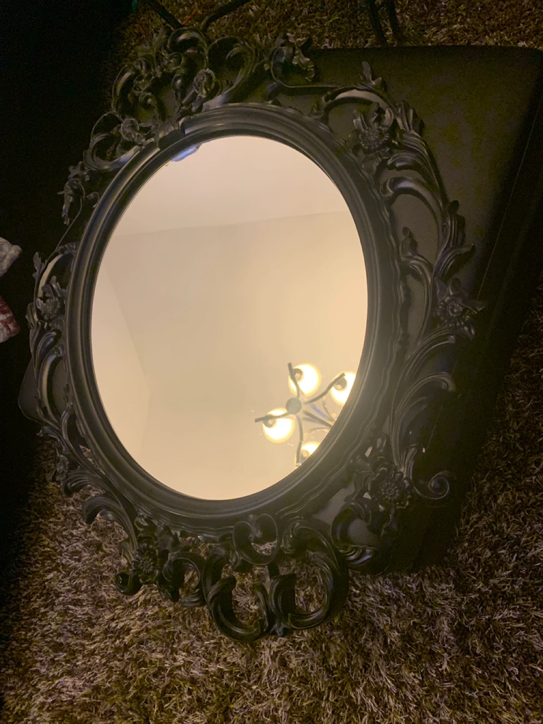 This is a decorative oval mirror with an ornate, black frame. It features intricate detailing for a classic look. It's suitable for adding a touch of elegance to any room.