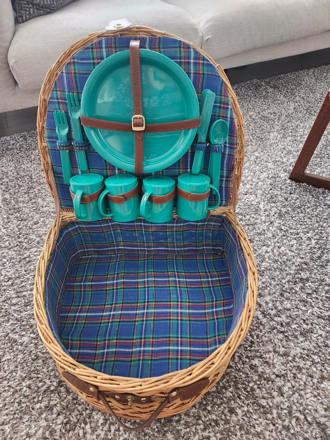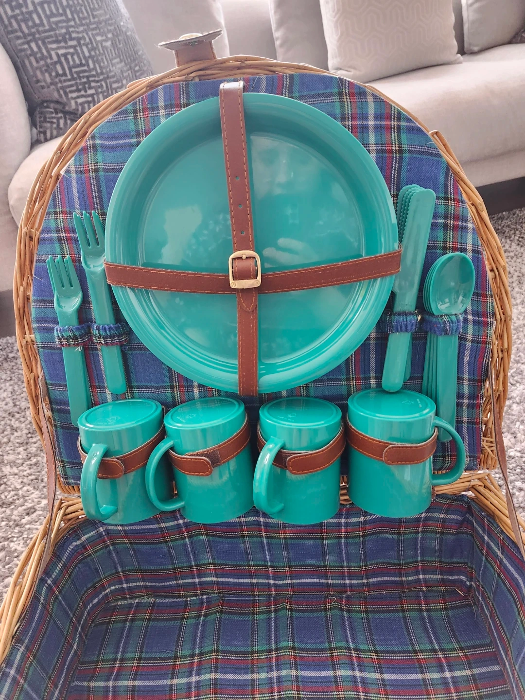 This sturdy D-shaped wicker basket features a beautiful blue tartan lining and a complete 4-person dining set in a vibrant teal finish. Perfect for park dates, beach trips, or backyard brunch.