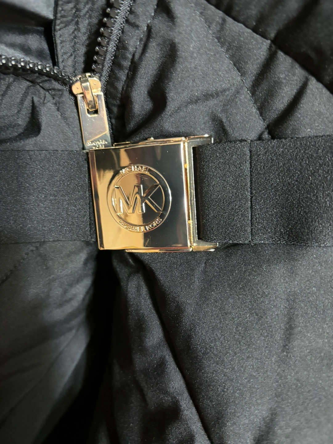 Black puffer coat with a removable fur hood, belt, and two zippered pockets on the front. The coat has a zipper closure and a Michael Kors logo on the belt buckle. Size 3X. Made in China.