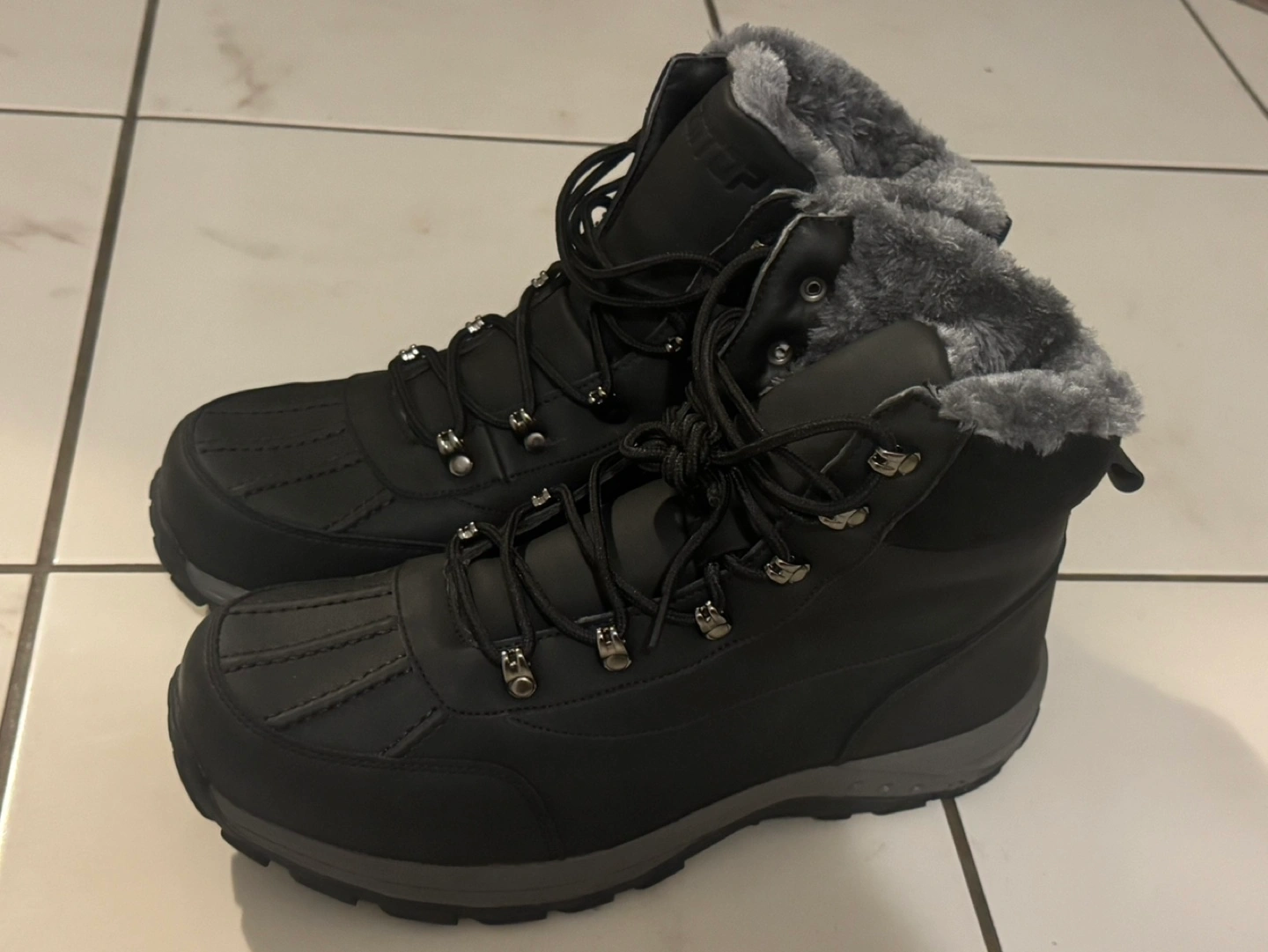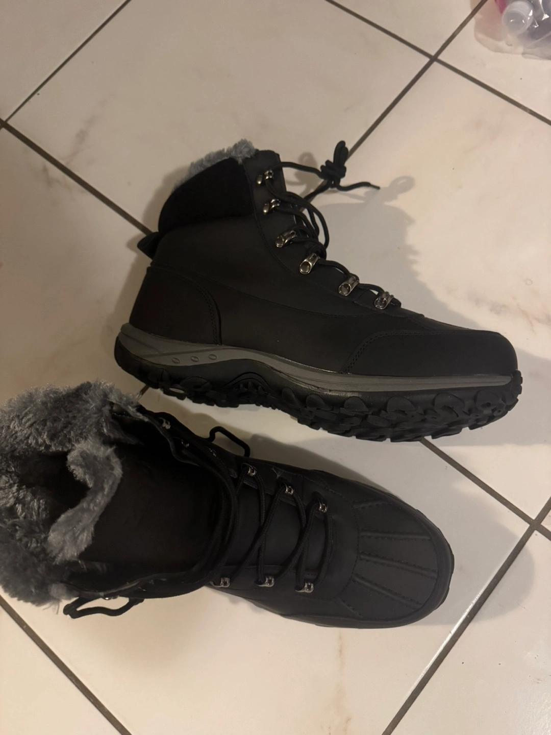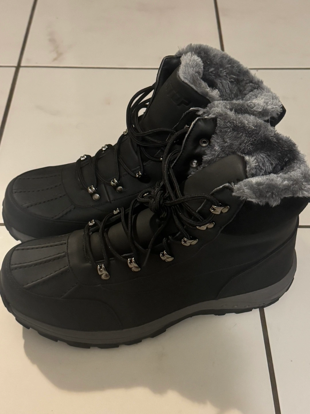 Black winter boots with grey fur lining. Lace-up style. Brand new in box never worn. Got it as a gift but too big for me. Selling it for $50. Or best offer