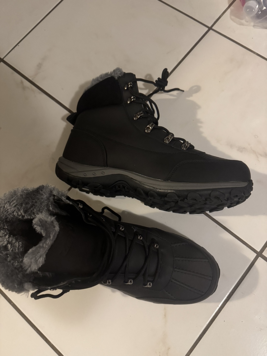 Black winter boots with grey fur lining. Lace-up style. Brand new in box never worn. Got it as a gift but too big for me. Selling it for $50. Or best offer