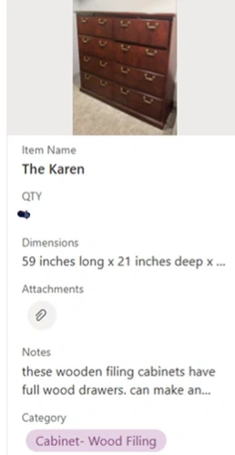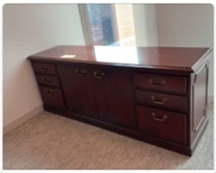 Wooden filing cabinet available. It's 59 inches long and 21 inches deep. The wooden filing cabinets have full wood drawers.