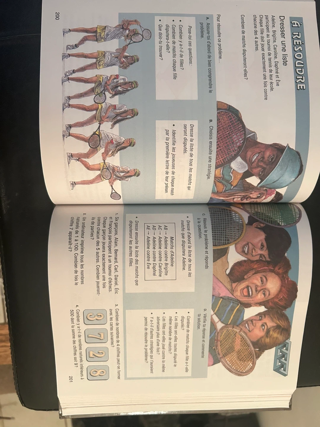 This is a "Découvertes Mathématiques" textbook, likely for elementary or middle school students. It appears to cover various math concepts with illustrations and exercises. The book includes problems related to counting, strategy, and problem-solving. A workbook or supplementary material might be included with numbered questions.