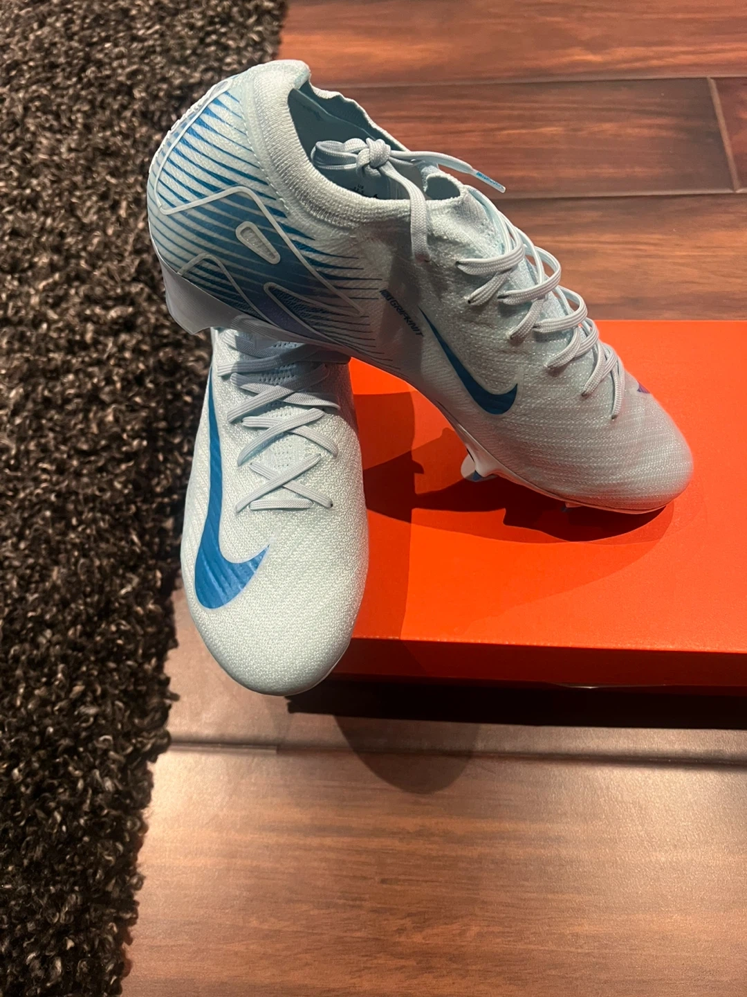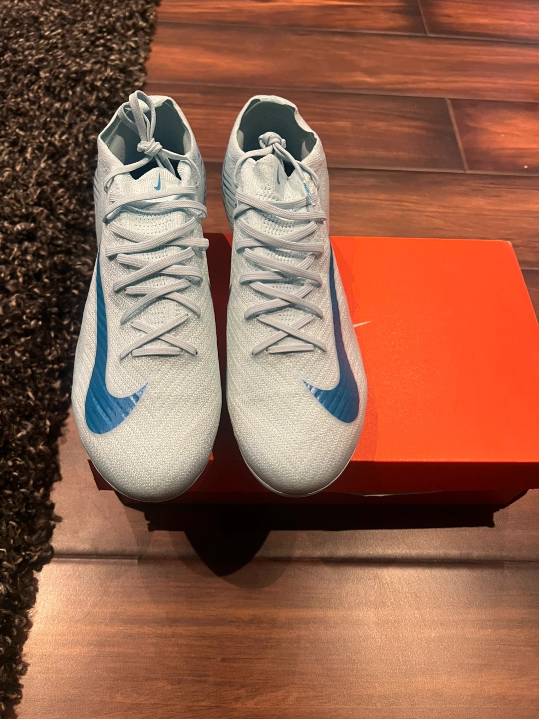Light blue Nike Mercurial soccer cleats. These cleats have a lace-up closure and a synthetic material upper. Comes with the original box.