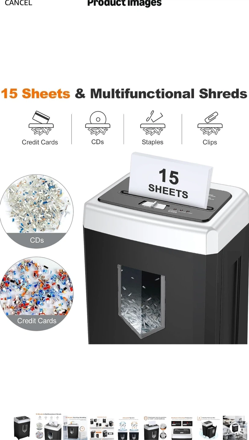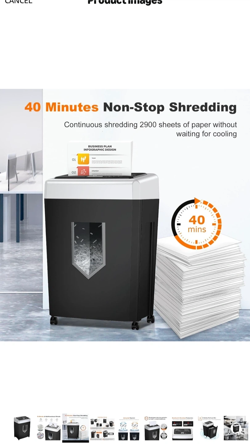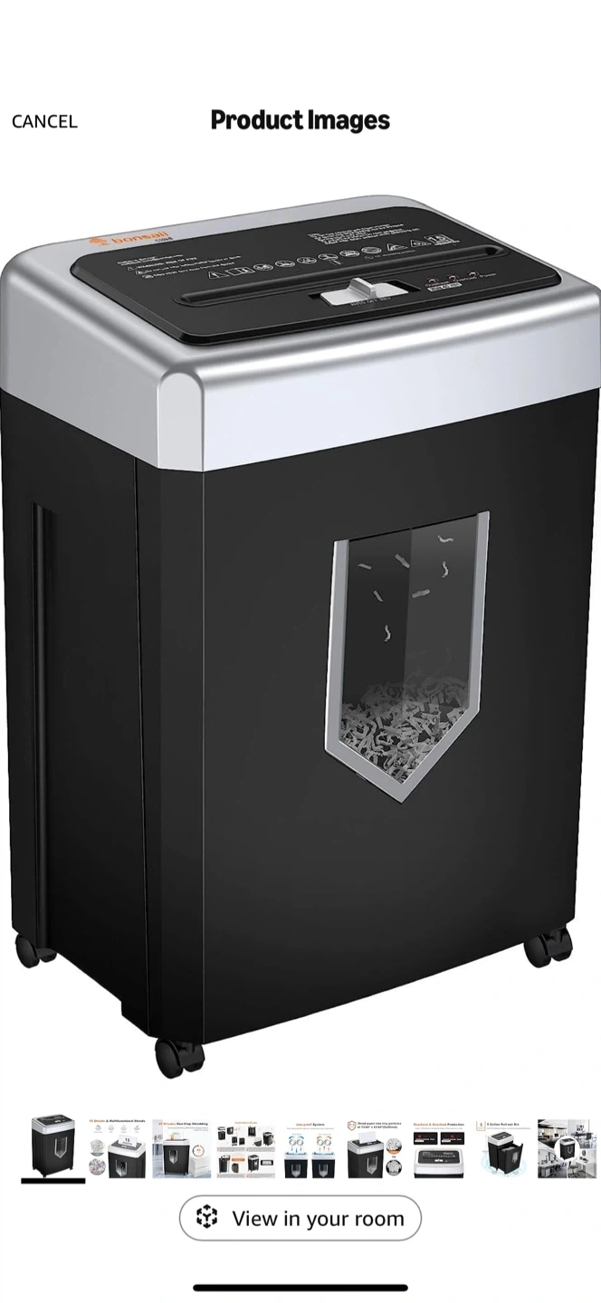 Selling a Bonsaii 15-Sheet Office Paper Shredder. It can shred for 40 minutes of heavy duty shredding. It has an Anti-Jam System and a P-4 High Security that supports CDs, credit cards, and staples. It also has a 5-gallon pullout bin. Originally bought for $321.43