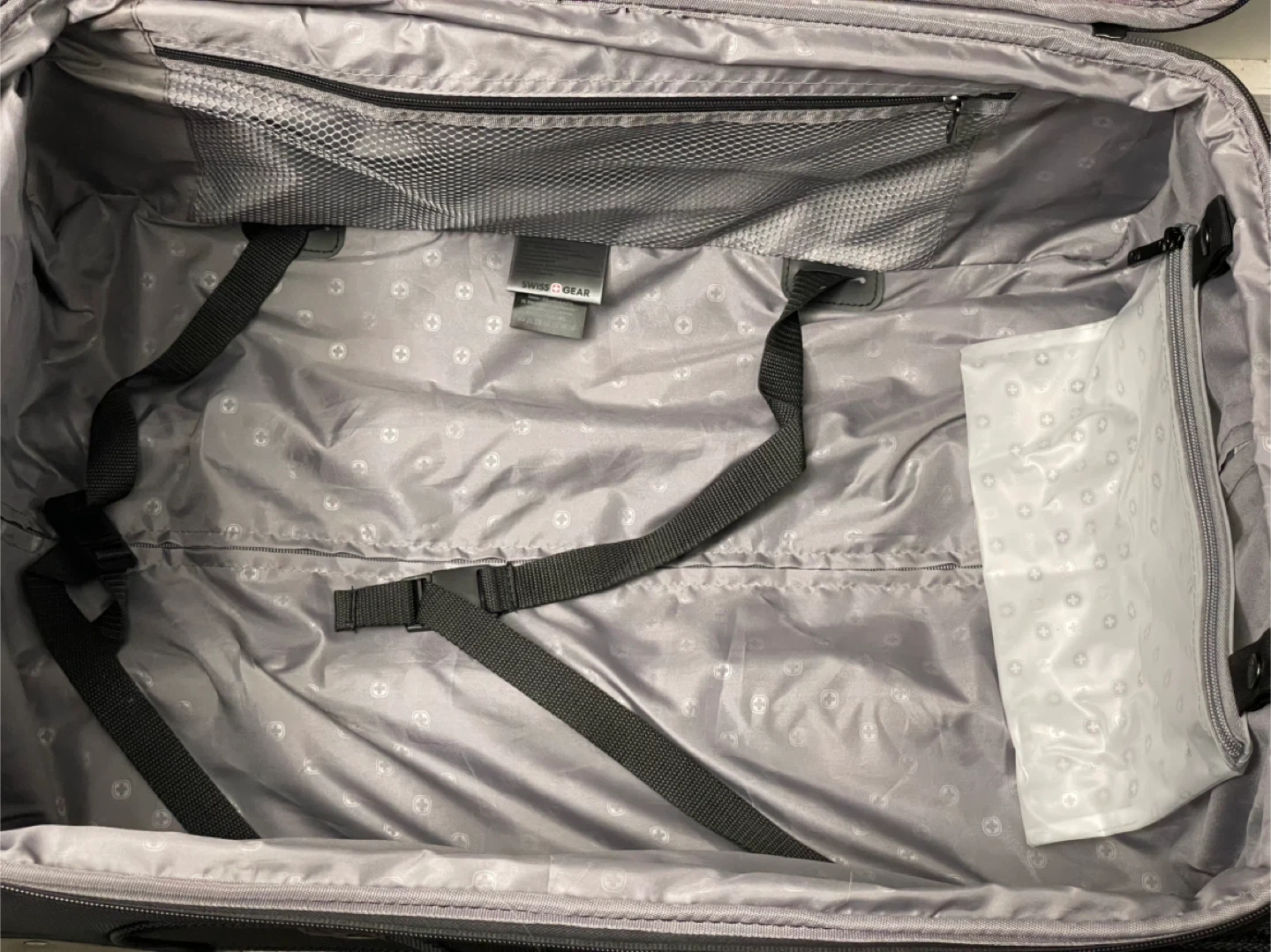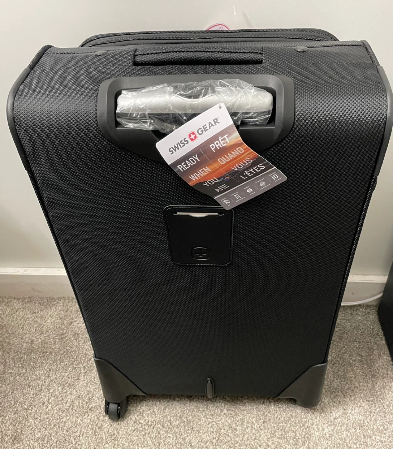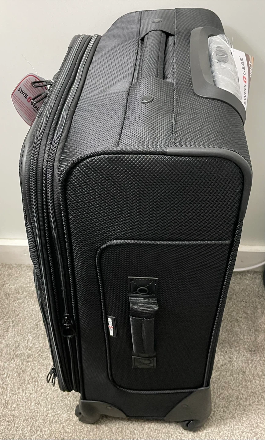 This is a black rolling suitcase from Swiss Gear. It's 25.5 inches tall. This luggage is ready for your next trip!