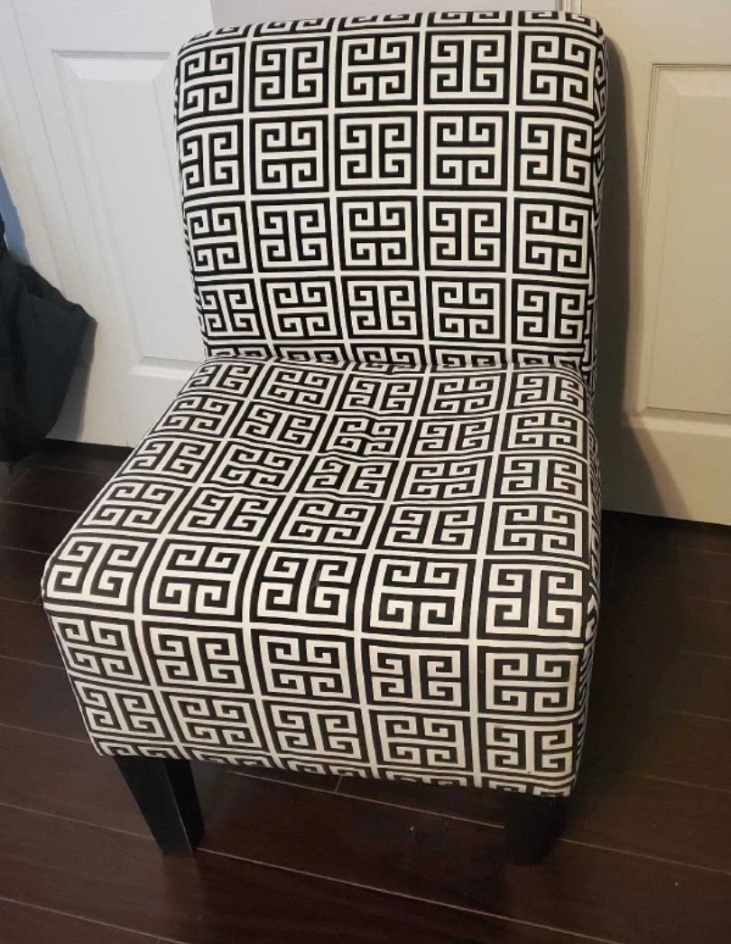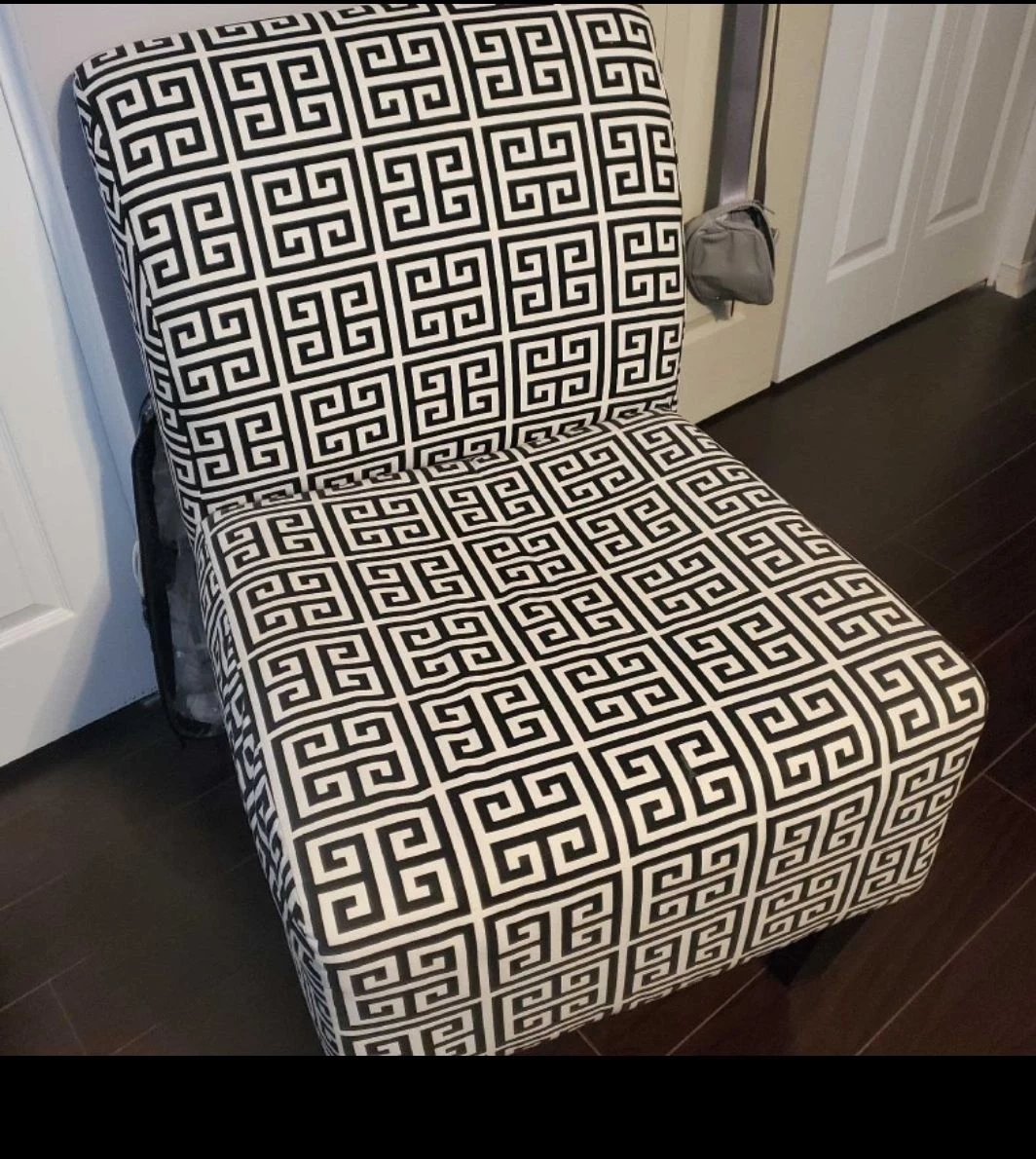 Elevate your living space with this stylish accent chair featuring a modern black and white geometric pattern. In excellent condition, this chair adds a touch of sophistication to any room. Its sturdy frame ensures durability, while the cushioned seat provides comfort for relaxation or entertaining guests.