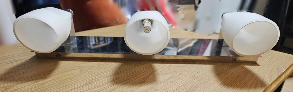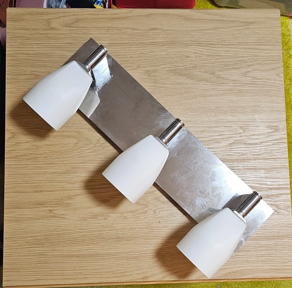 Here's a spotlight bar with three lights. It has a sleek, modern look with a silver-tone metal base and white shades. It's in great condition and ready to brighten up your space.