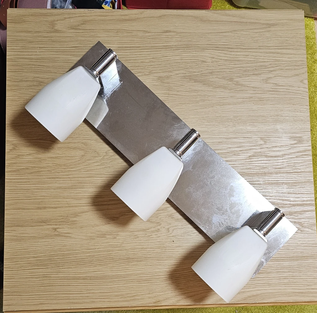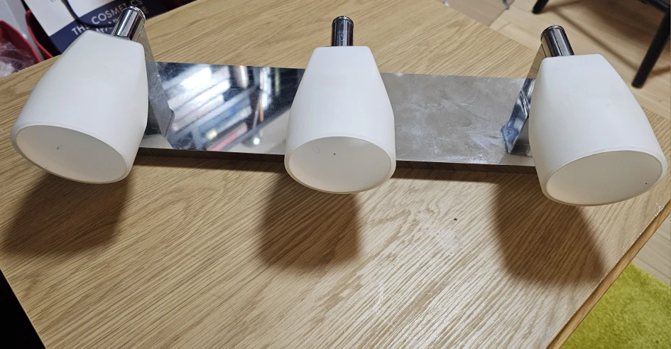 Here's a spotlight bar with three lights. It has a sleek, modern look with a silver-tone metal base and white shades. It's in great condition and ready to brighten up your space.