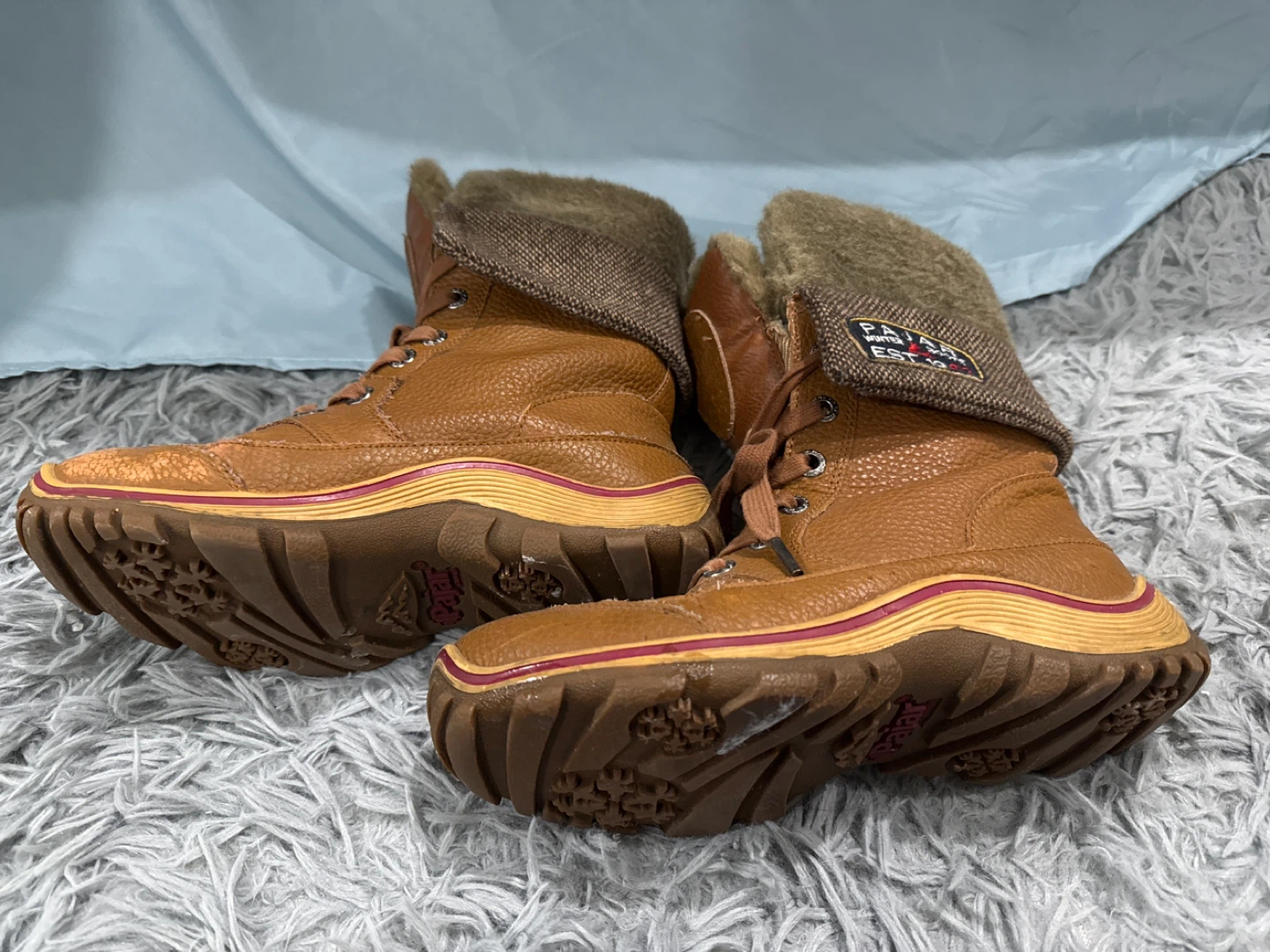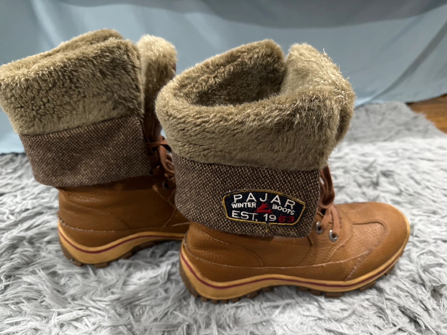 Selling a pair of Pajar winter boots. They're a stylish brown colour with a furry lining around the top. Perfect for keeping your feet warm and dry during the Canadian winter! The size isn't marked, so please check the photos to see if they'll fit