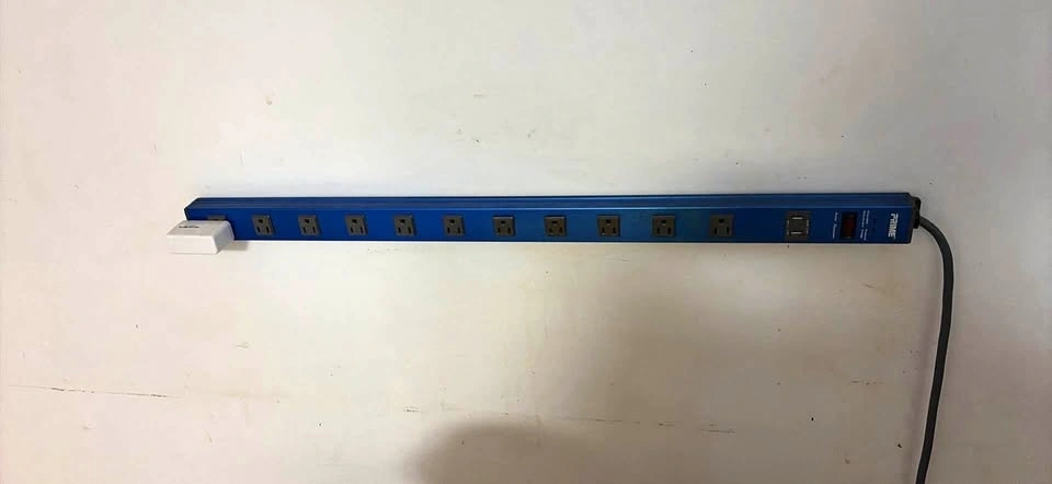Durable blue metal power strip with 10 grounded outlets and 2 USB ports. Includes a red power switch and a long heavy-duty cord. Metal housing is sturdy with mounting holes on the back.