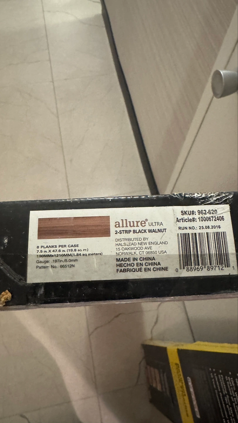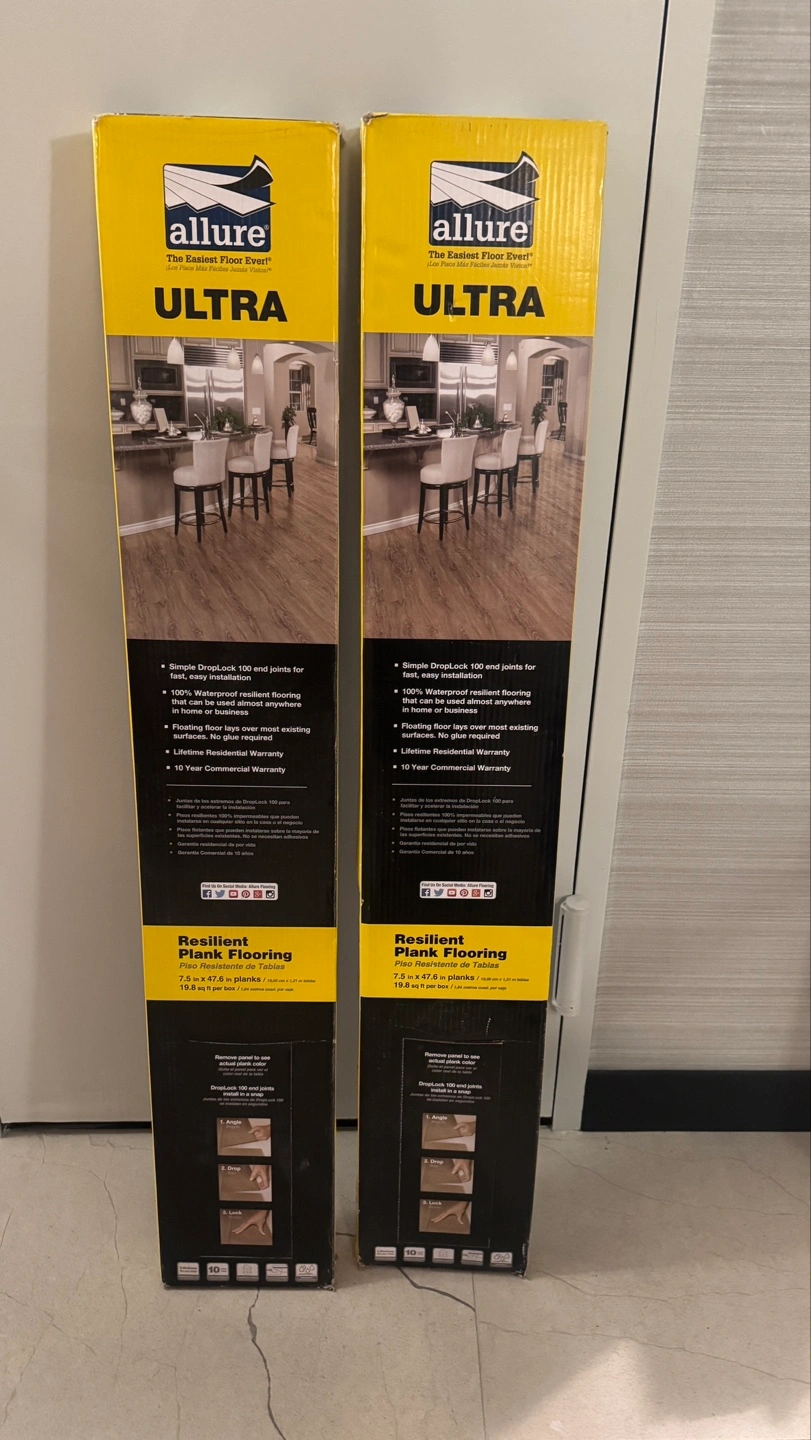 Two boxes of new Allure Ultra resilient flooring. 2-Strip Black Walnut pattern. Floating floor, easy installation. 15-year commercial warranty. Planks measure 7.5 in. x 47.6 in.