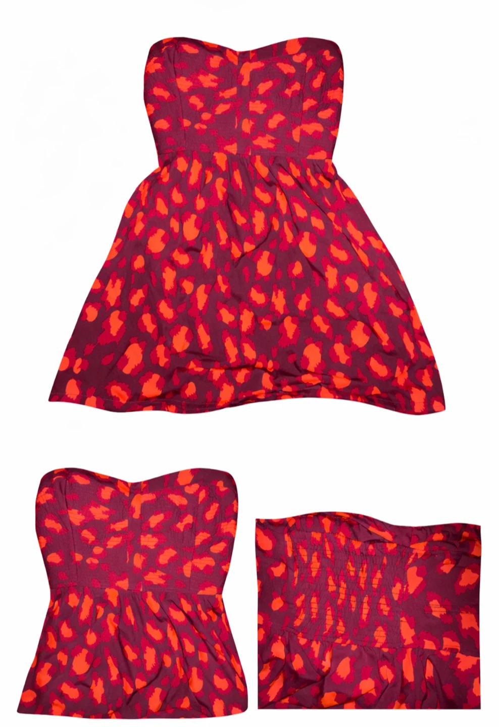 This Hurley strapless dress features a bold leopard print in shades of red and burgundy. It's made from 100% polyester. The smocked back provides a comfortable fit.
