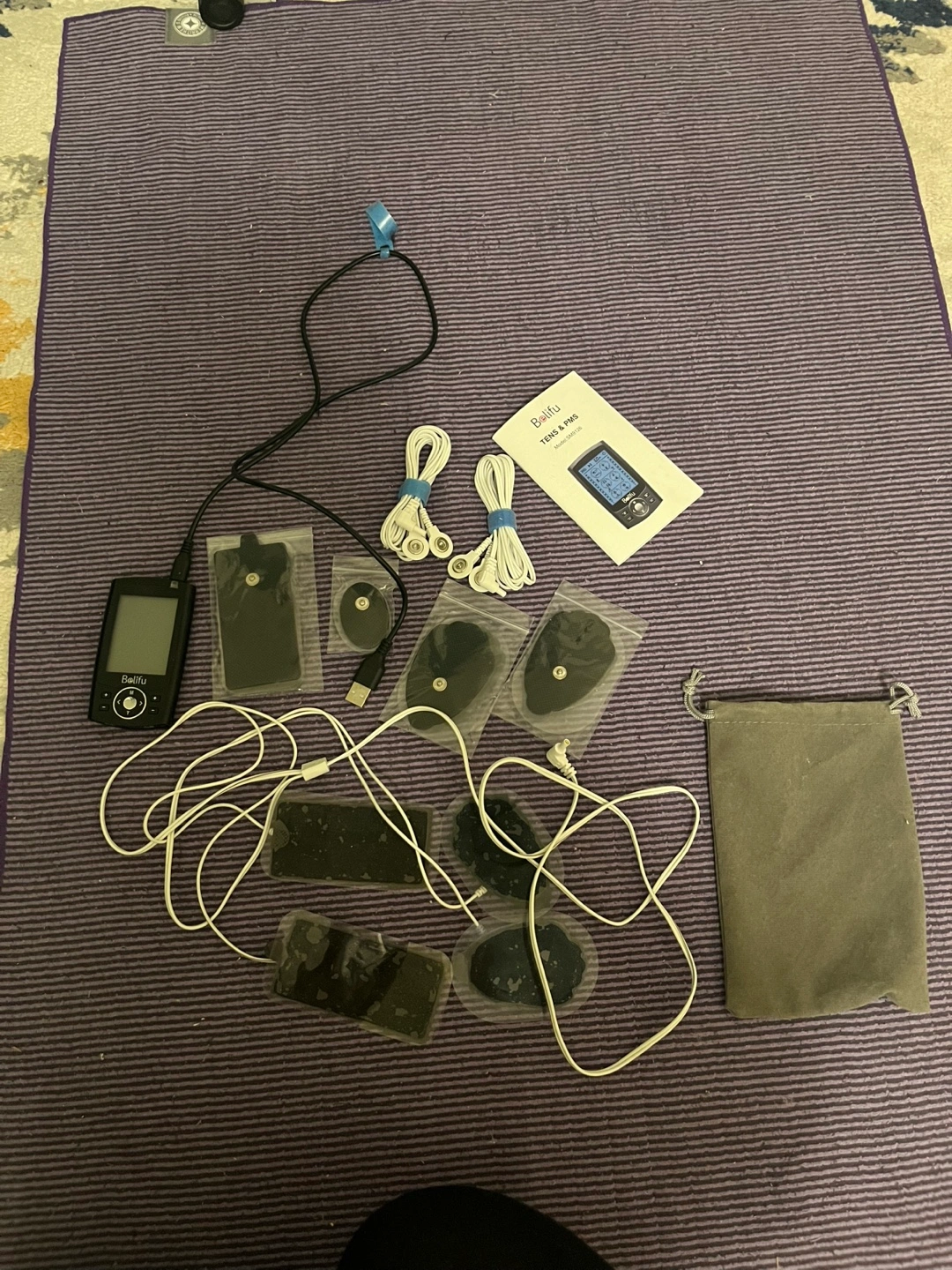 Balifu TENS & EMS machine with multiple electrode pads, wires, and a carrying pouch.
