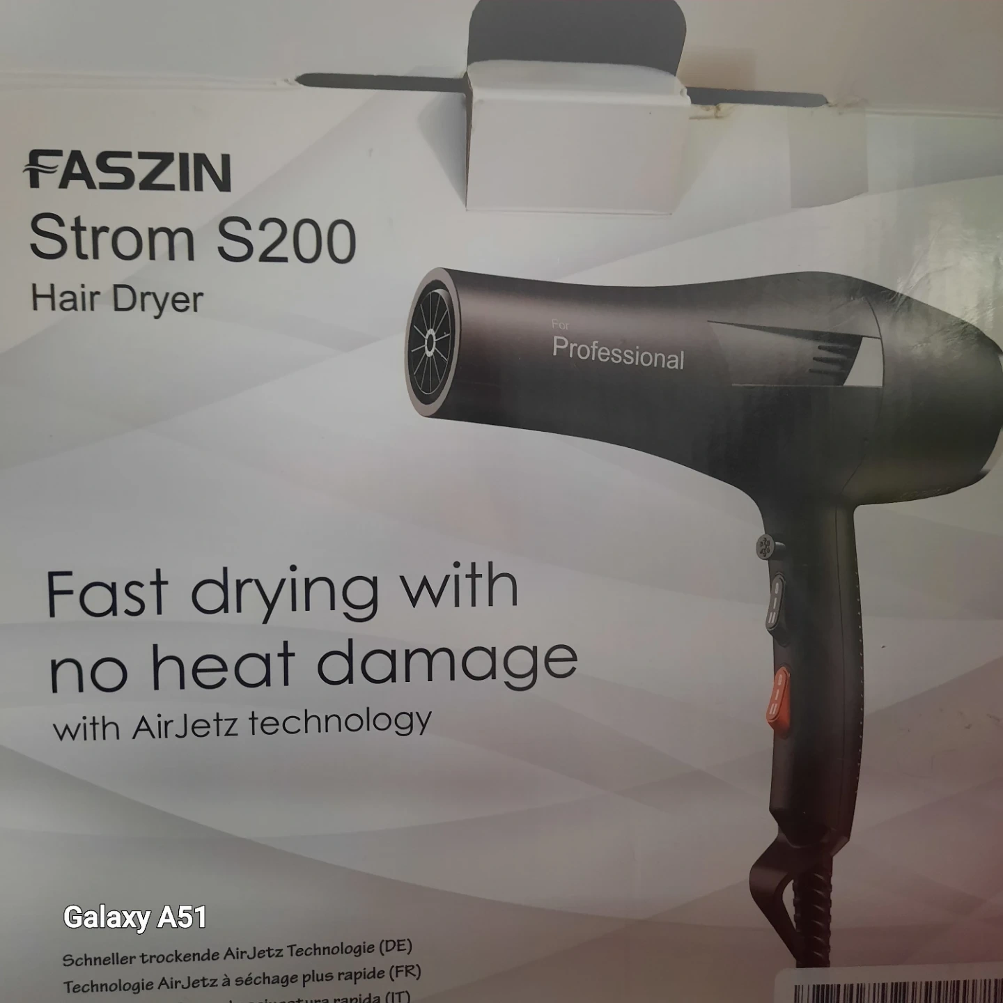 This Faszin Strom S200 hair dryer features AirJetz technology for fast drying without heat damage. It has multi-function 5 speed settings and 3 temperature settings. It comes with multiple attachments for versatile styling.