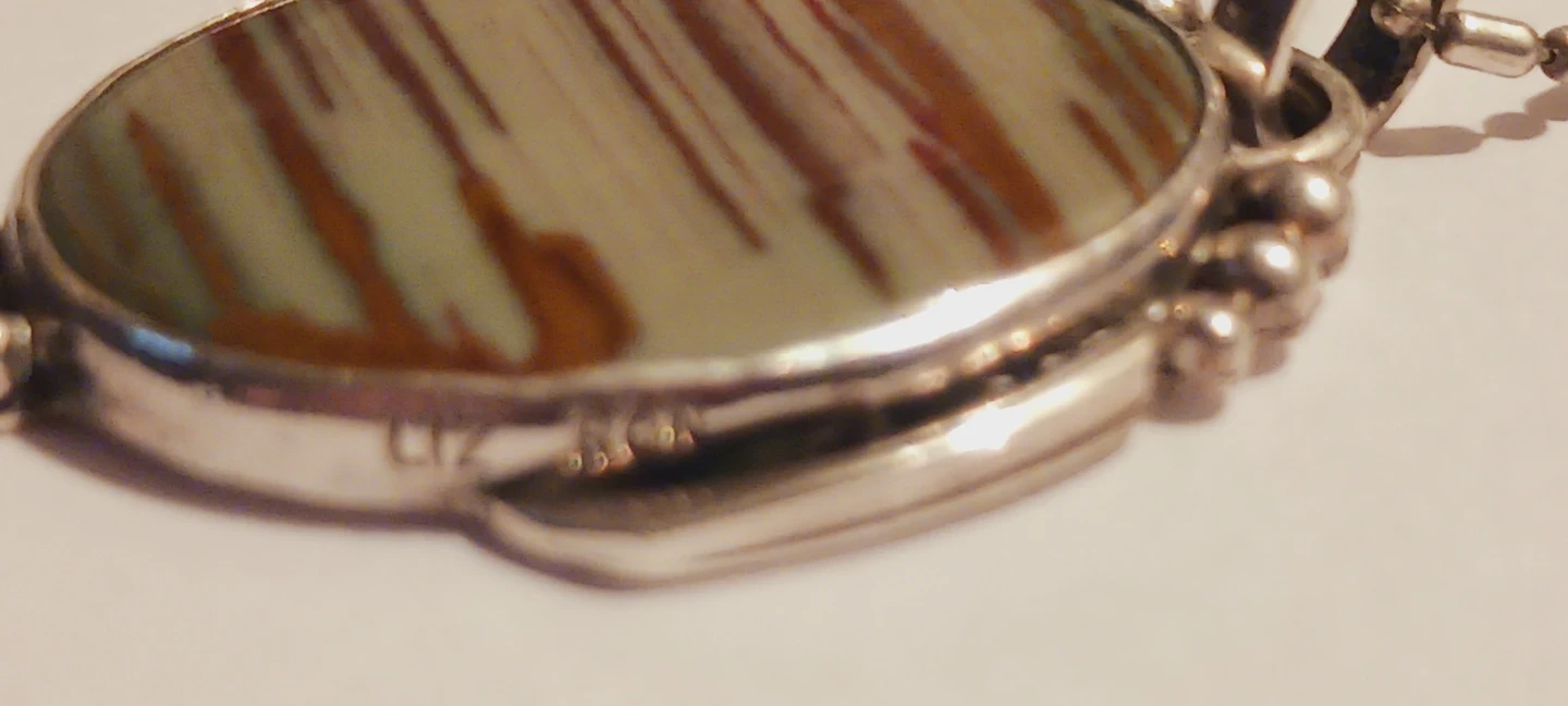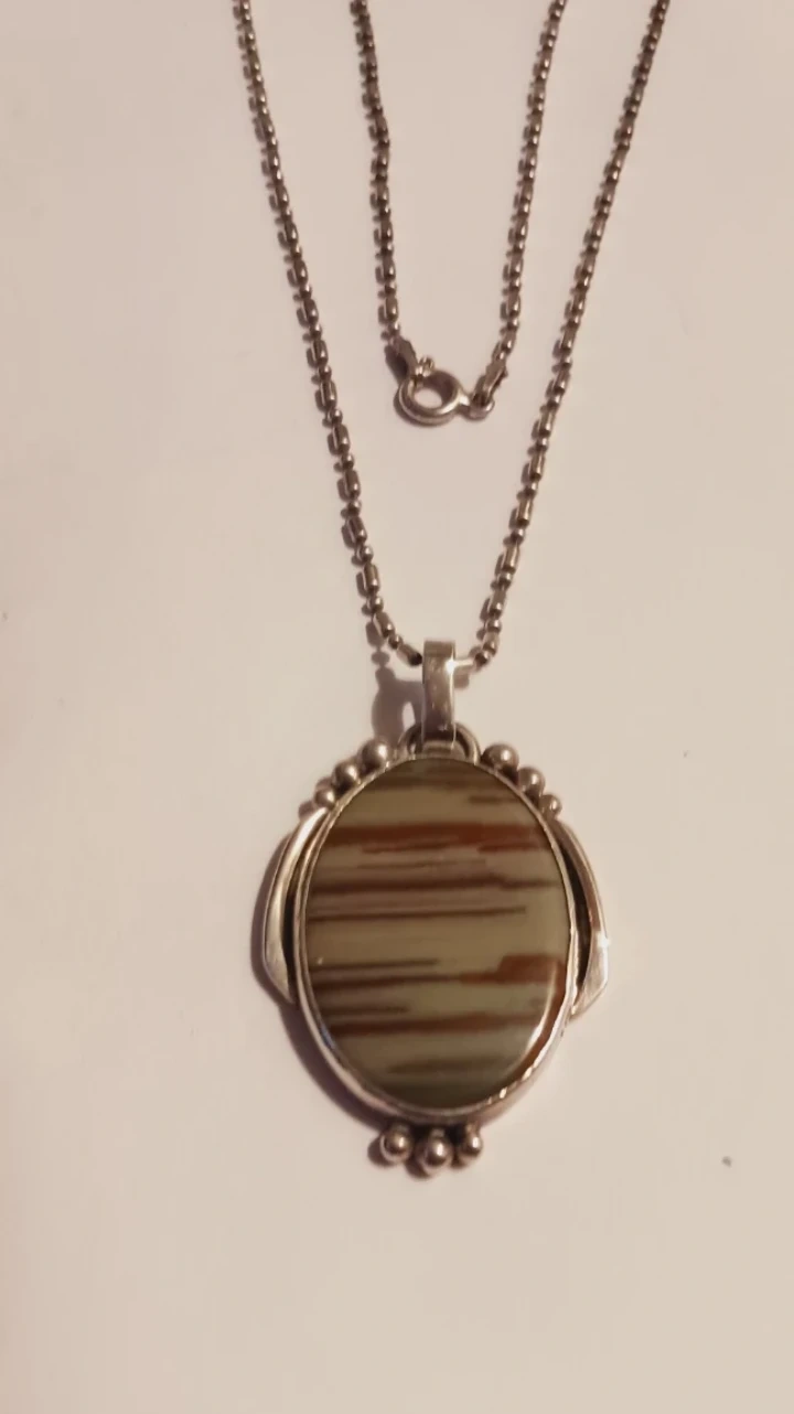 silver 925 Italy chain necklace.The stone has green and brown striped patterns. Pendant features decorative beading around the edge. Chain has a lobster clasp closure. Excellent condition.ALL MY PRICES ARE NEGOTIABLE. 18" long.